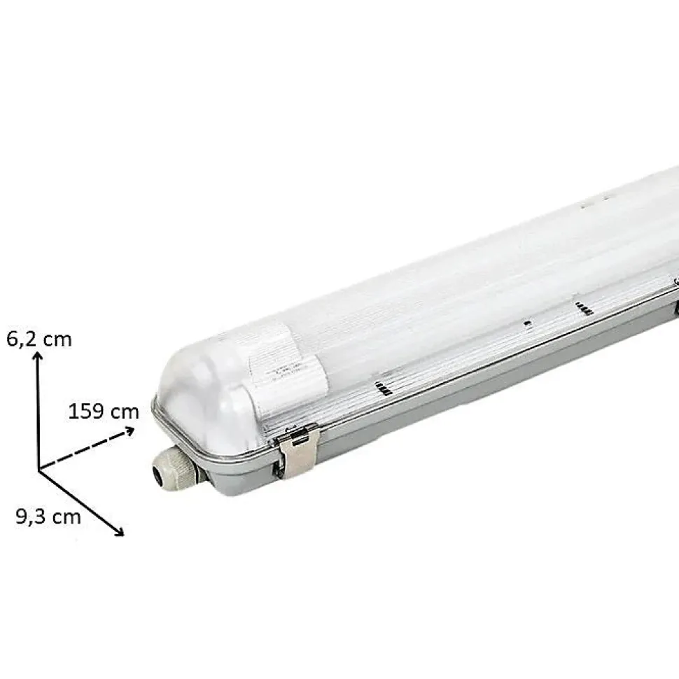 Kit réglette LED étanche IP65 + 2 tubes LED T8 150cm 22W (pack de 6) : la solution de relamping « zones humides/poussiéreuses » pour sécuriser vos installations (IP65) tout en abaissant la consommation avec 4048 lm pour 44W par kit.Confort visuel & éclairage homogène de ce kit réglette LED IP65 150cm (tubes T8, 180°)Chaque kit réglette LED 150cm + 2 tubes T8 diffuse en 180° pour éclairer large et limiter les zones d’ombre en réserve, garage, parking couvert, atelier ou cuisine pro. Avec 4048 lm par réglette et un IRC Ra80, vous obtenez une lumière exploitable pour la lecture, la circulation et le contrôle visuel. Le pack existe selon teinte chantier : blanc chaud (2300-3500K), blanc neutre (4000-5500K) ou blanc froid (6000-8000K).Rénovation express & pose installateur (pack x6 « chantier » prêt à déployer)Le pack de 6 permet de traiter une zone complète avec la même référence : vous standardisez le gabarit, les fixations et le raccordement. Le kit inclut 6 réglettes LED 150cm et 12 tubes T8 150cm 22W (2 par réglette) : moins d’aléas d’approvisionnement et une mise en service plus rapide en relamping.Performance & ROI (44W / 4048 lm par kit) – dimensionnement par packChaque réglette consomme 44W (2×22W) pour 4048 lm, soit 92 lm/W. En pack x6, vous déployez 24 288 lm pour 264W installés : un levier direct pour réduire la puissance installée tout en gardant un flux utile et uniforme sur les zones à longues durées d’allumage.Durabilité & étanchéité IP65 (maintenance réduite)Conception PVC robuste et légère, IP65 (poussière + projections/jet), alimentation 220-240V AC / 50-60Hz, dimensions 159 × 9,3 × 6,2 cm, durée de vie ~25 000 h et garantie 2 ans : moins d’infiltrations, moins de pannes, moins d’interventions.⚠️ Sécurité 220-240V (pro) : intervention hors tension, raccordements en boîtes/presse-étoupes