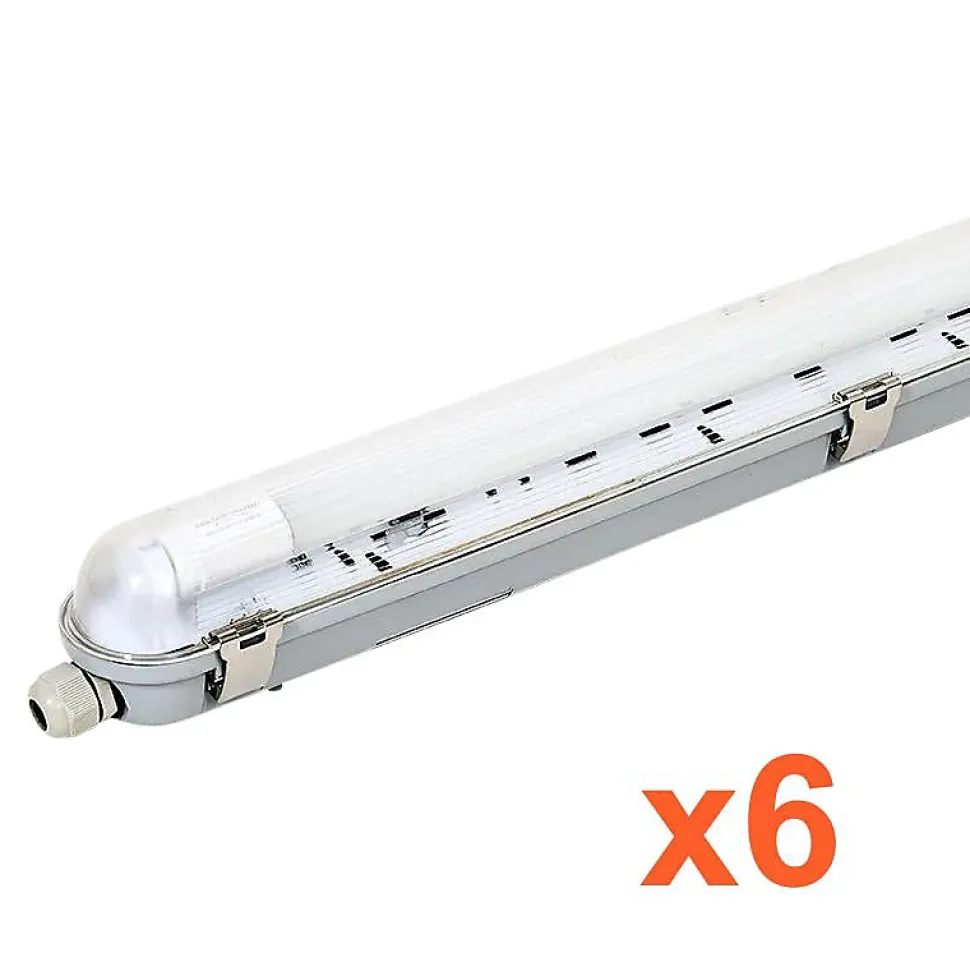 Kit réglette LED étanche IP65 + tube néon LED T8 120cm 18W (pack de 6) : la solution de relamping « locaux techniques/parkings » pour sécuriser l’éclairage en milieux humides et poussiéreux, en standardisant vos chantiers (230V, CE/RoHS).Confort visuel & éclairage fonctionnel avec ce pack de réglettes LED IP65 120cm (tube T8, 180°)Chaque kit réglette LED 120cm IP65 + tube T8 délivre 1656 lm avec une diffusion 180°, idéale pour limiter les zones d’ombre en réserves, garages, cuisines pro, couloirs techniques et parkings couverts. Avec IRC Ra80, vous gardez une lumière exploitable pour lecture d’étiquettes, circulation et contrôle visuel. Teintes disponibles selon chantier : blanc chaud (2300-3500K), blanc neutre (4000-5500K), blanc froid (6000-8000K).Rénovation express & déploiement chantier (pack x6 prêt à poser en saillie)Le pack de 6 rationalise la pose : même gabarit, mêmes fixations, même logique de raccordement. Chaque réglette se pose en saillie (mur/plafond) et se raccorde en 220-240V / 50-60Hz. Format idéal pour l’éclairage professionnel 129 × 6,3 × 6,2 cm : remplacement direct d’une ligne 120cm sans reprise lourde, parfait en relamping multi-points.Performance & ROI (18W, 1656 lm) – dimensionnement par packChaque kit consomme 18W pour 1656 lm (≈ 92 lm/W) avec un équivalent incandescence 126W. En pack x6, vous déployez 9936 lm pour 108W installés : un levier direct pour réduire la puissance sur des zones à forte durée d’allumage, tout en gardant un flux utile et une diffusion large (180°).Durabilité & normes (IP65, ~25 000h) – maintenance réduiteLe point clé terrain : IP65 (poussière + projections/jet) pour environnements humides/poussiéreux, avec une durée de vie annoncée ~25 000 h et garantie 2 ans. Certifications CE & RoHS pour sécuriser la conformité.⚠️ Sécurité 220-240V