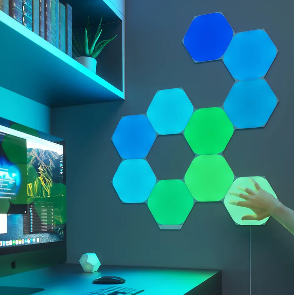 - Réagissent au toucher. Les Panneaux Nanoleaf Shapes vous permettent de créer des expériences tactiles immersives, les panneaux réagissent à votre toucher et vous permettent de jouer à des jeux interactifs.