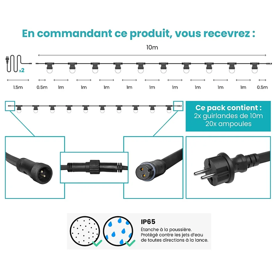 - ÉTANCHE IP65 ET SÉCURITÉ : Les ampoules de notre guirlande guinguette sont étanches aux normes CE et IP65, ne craignent pas la poussière et sont remplaçables !
