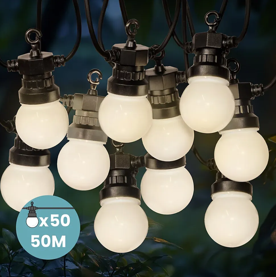 - LONGUEUR EXTRÊME : La guirlande guinguette d’une longueur de 50M est idéale pour les grands espaces tels que les parcs, chateaux ou mariages en exterieur. Idéal pour créer un sublime ciel guinguette avec les 50 bulbes blancs !