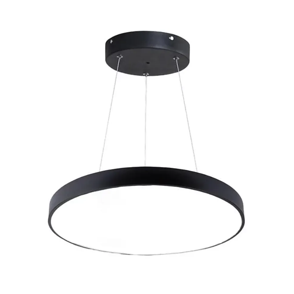 Découvrez notre Kit Plafonnier LED Noir 54W 60cm avec Kit de Suspension pour éclairer votre intérieur de façon puissante ! Caractéristiques du Kit Plafonnier LED Noir 54W 60cm avec Kit de Suspension Ce kit comprend un plafonnier d’une forte puissance de 54W pour 4050lm. Il est idéal pour éclairer une grande pièce avec sa grande taille (60cm de diamètre) et son angle d’éclairage de 120°. Le kit comprend également un kit de suspension pour suspendre votre plafonnier à des câbles et un plateau et le transformer en véritable objet design ! Les trois câbles font 100cm de longueur mais vous pouvez les régler sur la longueur que vous désirez pour un plafonnier suspendu plus ou moins haut. Installation du Kit Plafonnier LED Noir 54W 60cm avec Kit de SuspensionPour l’installer il faut utiliser les câbles pour rejoindre le plafonnier et le plateau puis fixer le plateau à votre plafond.Si vous voulez finalement plus tard installer votre plafonnier directement en saillie au plafond, il suffira de le décrocher et de fixer le plafonnier sans les câbles.