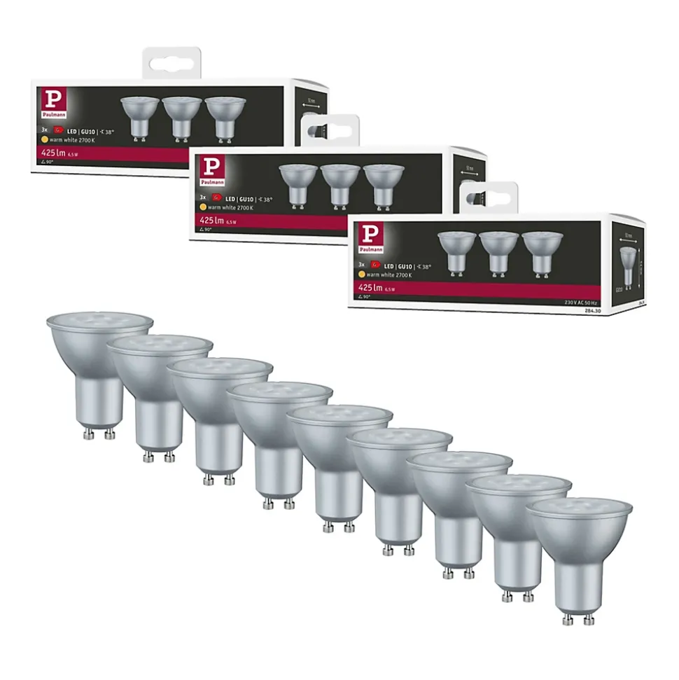 Les lampes à réflecteur assurent une lumière dirigée dans les projecteurs, les spots et les downlights. Le faisceau lumineux met en scène les objets de décoration et d’aménagement de manière ciblée. Dans ce kit attractif, le kit multiple de 3 sources lumineuses à réflecteur LED est inclus 3 fois. Il est ainsi possible de passer à la technique LED efficace à un prix avantageux ou de constituer des stocks. Les sources lumineuses créent une température de couleur blanc chaud agréable et s’adaptent à toutes les douilles GU10 disponibles dans le commerce. Les lampes LED Paulmann portant le label Eye friendly offrent une lumière confortable qui ménage les yeux. Que ce soit pour travailler, lire ou se détendre, les lampes contribuent au meilleur confort visuel.