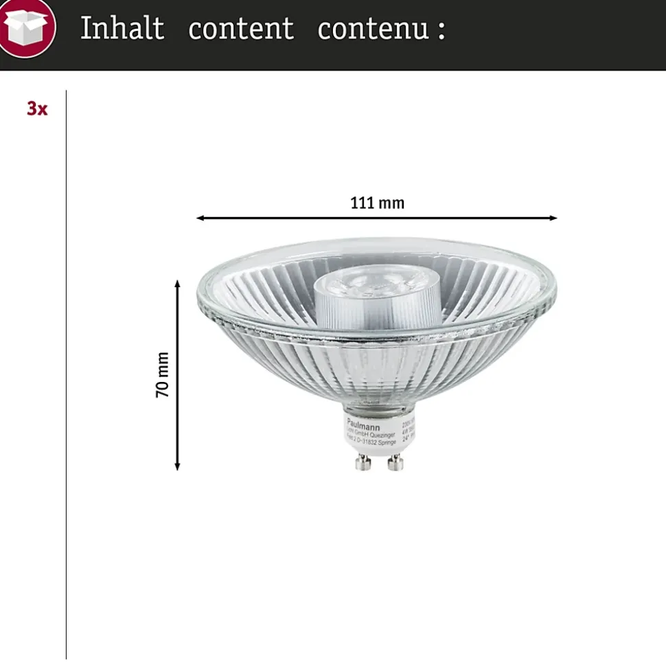 Le kit de trois réflecteurs LED gradables est spécialement conçu pour une utilisation dans les projecteurs, spots et encastrés. Grâce à la technologie LED performante et un culot GU10, ils offrent une lumière dirigée et une longue durée de vie. Avec une température de couleur de 2700 K, l’ampoule diffuse une lumière blanc chaud. Avec sa lumière ciblée, elle convient pour une utilisation dans les pièces de vie, les bureaux ou dans le domaine de la restauration.