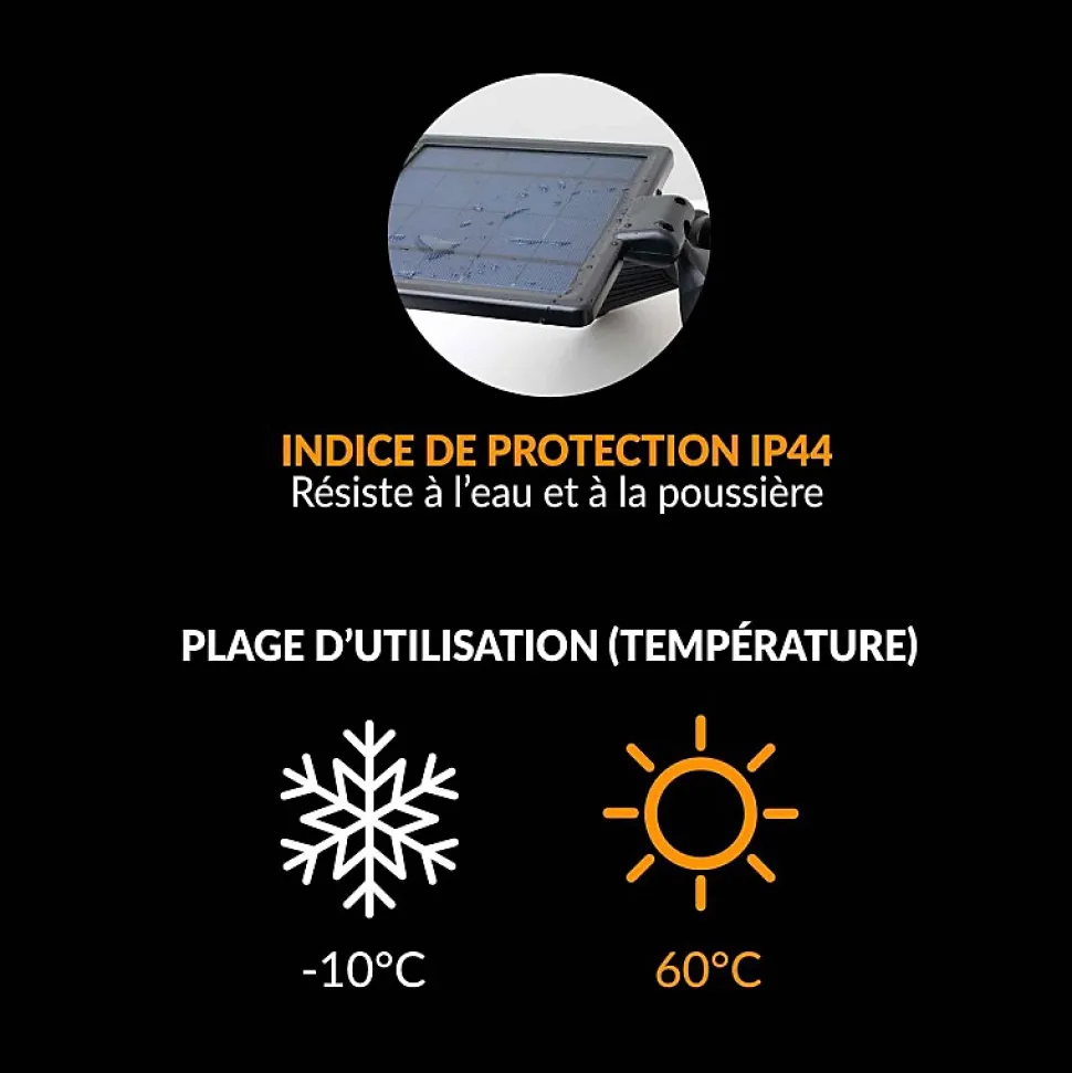 - Caractéristiques : taille du panneau solaire : 144×140 mm / Indice de protection : IP44 / plage d’utilisation : -10°C à 60°C / accessoires inclus : 4 vis et 4 chevilles