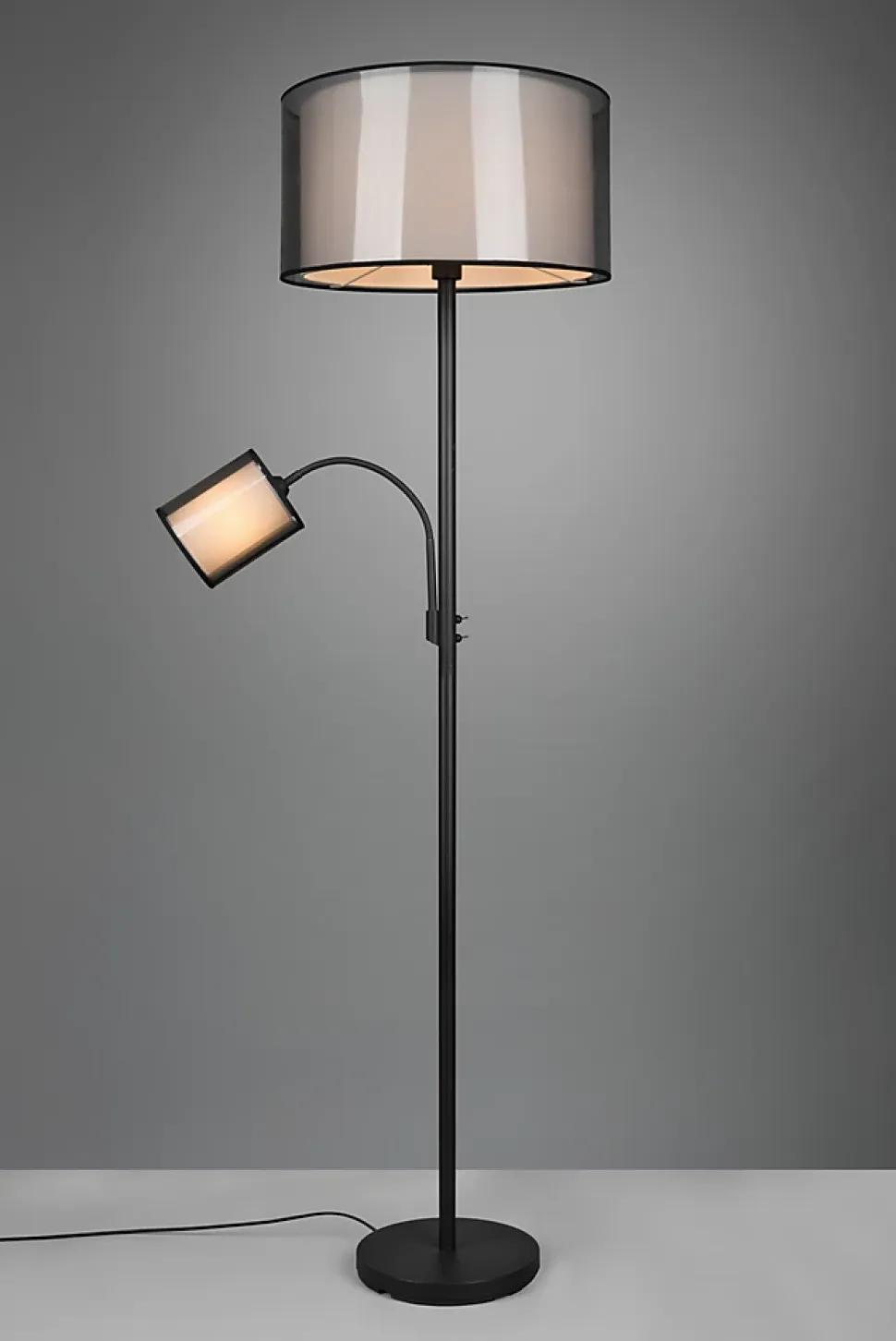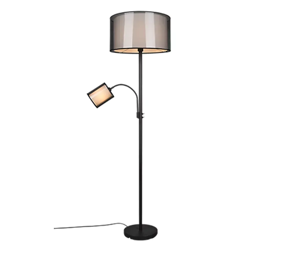 Ambiance chaleureuse et style moderne avec le lampadaire BURTONLe lampadaire Burton de TRIO incarne à merveille la convivialité grâce à son double abat-jour combinant un intérieur en tissu blanc et un extérieur en organza fumé. Ce jeu de matières crée une lumière douce et enveloppante, idéale pour instaurer une atmosphère cosy dans votre salon ou votre entrée.Polyvalence et praticité au rendez-vousDoté de deux sources lumineuses – une principale (E27) et un bras de lecture supplémentaire (E14) – ce lampadaire s’adapte à tous vos besoins : lecture, détente ou éclairage d’ambiance. Grâce aux interrupteurs séparés, vous contrôlez chaque lumière indépendamment pour un confort optimal.Design raffiné et adaptableLe mélange du métal noir mat et des abat-jour transparents fumés confère au lampadaire Burton une allure élégante qui s’intègre aisément dans des intérieurs modernes ou contemporains. Sa silhouette élancée (174 cm de hauteur) en fait un véritable atout déco sans encombrer l’espace.Un choix malin et durableCompatible avec des ampoules LED (non incluses), ce lampadaire vous assure un éclairage efficace tout en vous permettant de réduire vos coûts énergétiques jusqu’à 80 %. Durable, il contribue à protéger l’environnement tout en illuminant votre quotidien.