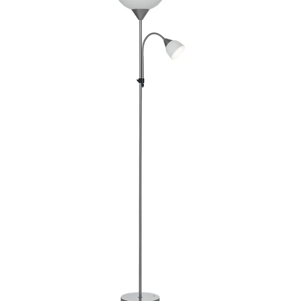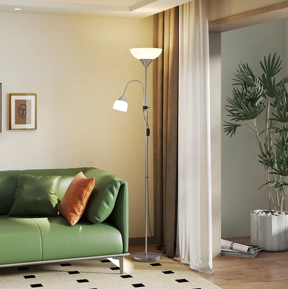 Cette magnifique lampe sur pied design moderne apportera une touche de modernité à votre intérieur. Doté de 2 têtes, il habillera et décorera parfaitement votre salon, bureau ou chambre. N’hésitez plus, ce lampadaire illuminera parfaitement votre maison !Caractéristiques :- Le lampadaire de salon mère-fille s’adapte à tous les endroits- Le col de cygne peut facilement s’étirer et changer la direction de la tête- Interrupteur avec 2 boutons pour contrôler séparément les 2 têtes- Le cadre en métal de haute qualité offre une position sûre- Lampe sur pied à socle E27 et E14 (les ampoules ne sont pas incluses)- Le long câble d’alimentation élargit la zone d’utilisationSpécifications :- Couleurs : argent, blanc- Matériaux : base en métal, abat-jour en plastique- Dimensions totales : Ø28 x 179,5H cm- Dimensions de l’abat-jour : 28 cm (grand), 12 cm (petit)- Dimensions de la base : Ø24 x 3H cm- Tension d’entrée : 230V/50HZ
