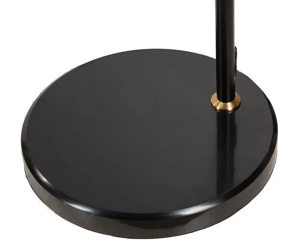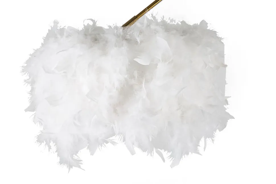 Lampadaire en métal noir au design arqué et linéaire doté d’un élégant abat-jour en plumes synthétiques