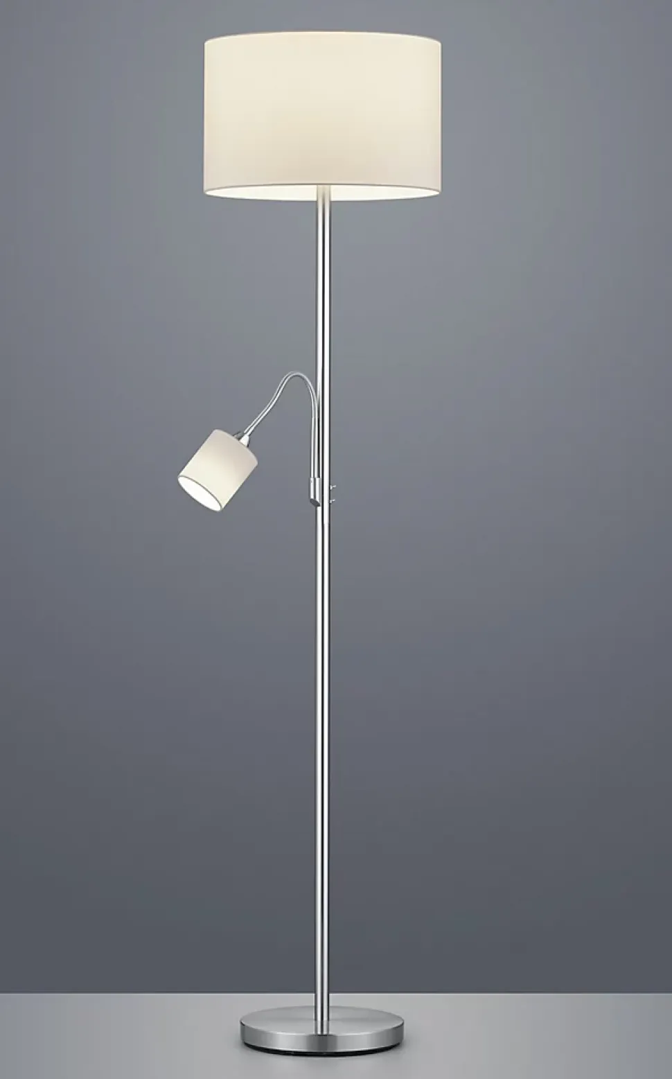 Un lampadaire 2 en 1 pour un éclairage sur-mesureLe lampadaire HOTEL de Trio combine habilement un éclairage d’ambiance et une liseuse intégrée. Son design épuré et contemporain, associant métal nickel mat et tissu blanc, trouve sa place aussi bien dans un salon, une chambre ou un bureau.Une liseuse flexible ultra pratiqueGrâce à son bras de lecture orientable, ce lampadaire offre une solution parfaite pour lire ou travailler dans les meilleures conditions. Les deux sources lumineuses sont équipées d’interrupteurs indépendants, permettant de choisir entre lumière d’ambiance ou lumière directionnelle selon vos besoins.Compatibilité LED pour une efficacité optimaleCe modèle est conçu pour recevoir des ampoules E27 (max. 60W) et E14 (max. 18W). Pour des performances accrues et des économies d’énergie allant jusqu’à 80 %, nous recommandons vivement l’utilisation d’ampoules LED, alliant longue durée de vie, faible consommation et chaleur minimale.