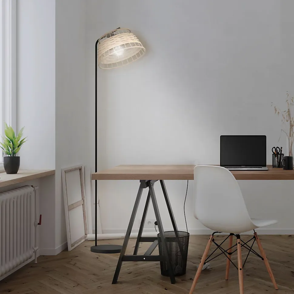 - Le lampadaire UMSTON se compose d’un abat-jour en forme de cloche, en rotin tressé et d’un pied en métal noir