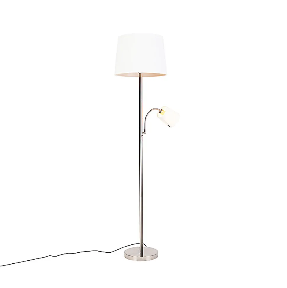 Le Retro est un magnifique lampadaire classique. L’acier intemporel est fini avec un abat-jour blanc. Ce lampadaire dispose également d’une deuxième source lumineuse sous la forme d’une liseuse ultra-pratique, faisant ainsi d’une pierre deux coups ! Cette liseuse est également dotée d’un abat-jour blanc assorti et d’un bras flexible, ce qui vous permet de l’orienter dans toutes les directions ! La lumière principale peut être facilement allumée/éteinte au niveau de la prise, et la liseuse via un bouton situé sur le cadre. La lampe peut également être atténuée à l’aide d’un variateur externe (non inclus). Cette lampe mesure 158 cm de haut et le bras flexible 30 cm de long. Le lampadaire nécessite encore deux ampoules. Pour la lampe principale, choisissez une ampoule E27 avec un nombre de lumens un peu plus faible pour une ambiance plus tamisée, et une ampoule E14 puissante pour la liseuse afin de pouvoir lire correctement. Son design intemporel est parfait pour votre salon.