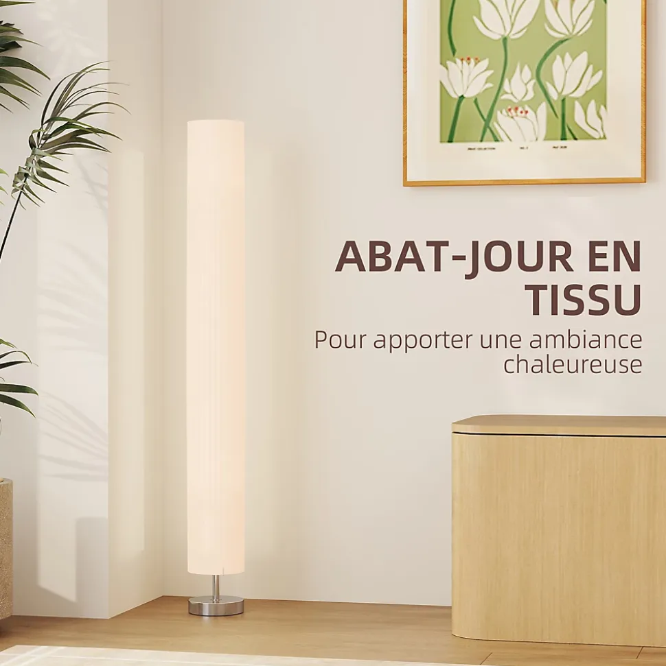Cette jolie lampe en colonne sur pied apportera une touche de modernité à votre intérieur. Elle diffusera parfaitement sa lumière dans votre salon, chambre ou bureau grâce à son éclairage tamisé. N’hésitez plus, ce luminaire vous satisfera !Caractéristiques :- Lampadaire de chambre design élégant alliant modernité et simplicité habillera parfaitement votre intérieur : salon, chambre, bureau, etc- Son éclairage tamisé créera une ambiance chaleureuse et conviviale- Lampe de salon sur pied robuste et résistant grâce à sa base en acier inox et son support en métal- Des patins antidérapants ont été conçu pour plus de stabilité- Installation simple et pratique grâce à sa notice d’utilisation incluse- Attention: Les ampoules ne son sont pas inclusesSpécifications :- Couleur principale : blanc- Matériaux principaux : acier inoxydable, tissu de polyester et métal- Dim. totales : 14L x 14l x 120H cm- Dim. support de lampe : 14L x 14l x 92H cm- Dim. abatjour : 14L x 14l x 110H cm- Douille : 2 x E27(ampoules non incluses)- Puissance max. de l’ampoule : 40W- Certifié aux normes : CE et ROHS- Tension d’entrée : 220-240V/50Hz- Réf. : B31-018V90WT