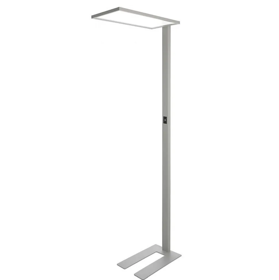 Les caractéristiques techniquesCe lampadaire de bureau est en aluminium de couleur grise. Il possède un flux lumineux très important de 6200 lumens que vous pourrez régler facilement grâce à la fonction dimmage sensitif.Il diffuse une lumière blanc neutre (lumière du jour).Pour un meilleur confort visuel, le coefficient d’éblouissement est inférieur à 19.L’indice de rendu des couleurs est supérieur à 80.La qualité des composants de ce luminaire permet un usage intensif.Les avantages esthétiquesL’esthétique sobre et minimaliste de cette lampe de bureau sur pied lui pemet de s’intégrer discrètement à tout type de décoration.Son panneau éclairant est transparent.Elle vous procurera un éclairage dynamisant et propice au travail tout en respectant votre confort visuel grâce à un faible coefficient d’éblouissement.Avec la technologie Led, vous n’aurez pas à subir le scintillement désagréable des tubes néon.Les angles d’éclairage permettent d’éviter les zones d’ombre.