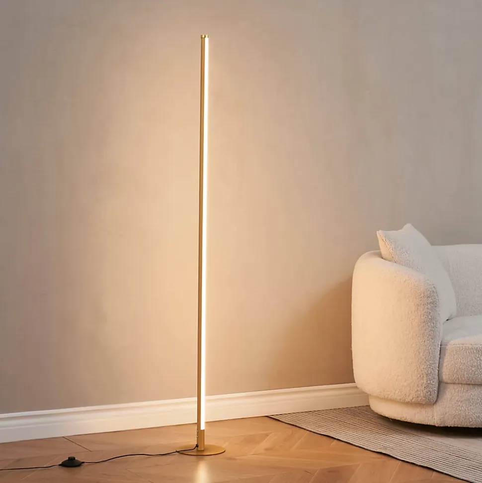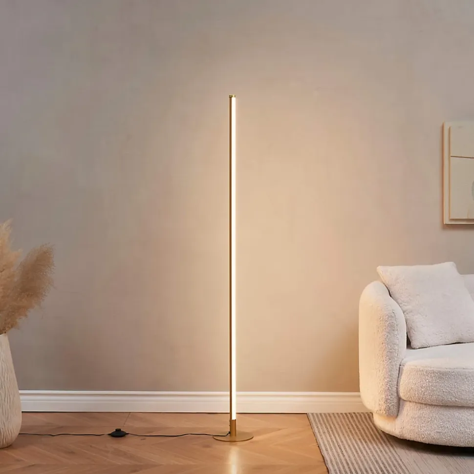 Sloane est un lampadaire en finition dorée au design simple et élégant, parfait pour un intérieur moderne. Sa structure élancée, d’une hauteur de 150 cm, repose sur un socle rond de 18 cm, offrant à la fois solidité et légèreté. Équipé d’une LED intégrée, il diffuse une lumière chaude de 3000K, idéale pour instaurer une atmosphère cosy dans un salon, une chambre ou un bureau. Grâce à son variateur de luminosité intégré, l’intensité de la lumière peut être ajustée selon vos envies.) Assemblage simple requis (