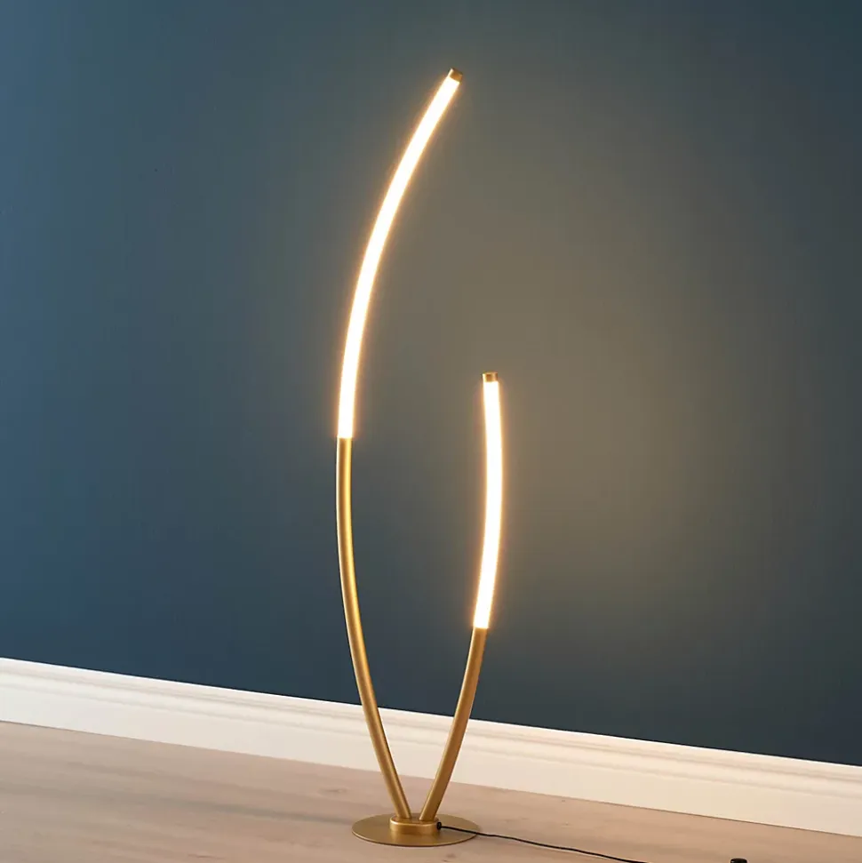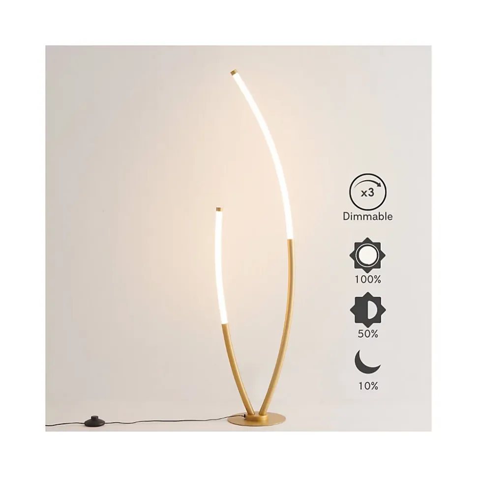 Apportez une touche de luxe à votre intérieur avec le lampadaire Moa. Son design ultramoderne, accentué par deux arcs dorés et des LED intégrées (18W), évoque le raffinement et l’élégance. Créez une atmosphère contemporaine et captivante dans votre salon ou votre bureau grâce à cet éclairage remarquable. Avec un rendu lumineux blanc chaud de 3000 kelvins, Moa offre une lumière douce et enveloppante. Sa fonctionnalité remarquable réside dans son variateur intégré, vous permettant de moduler l’intensité lumineuse selon vos besoins grâce à l’interrupteur sur câble en trois temps.) Assemblage simple requis (