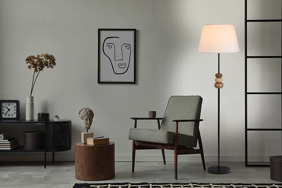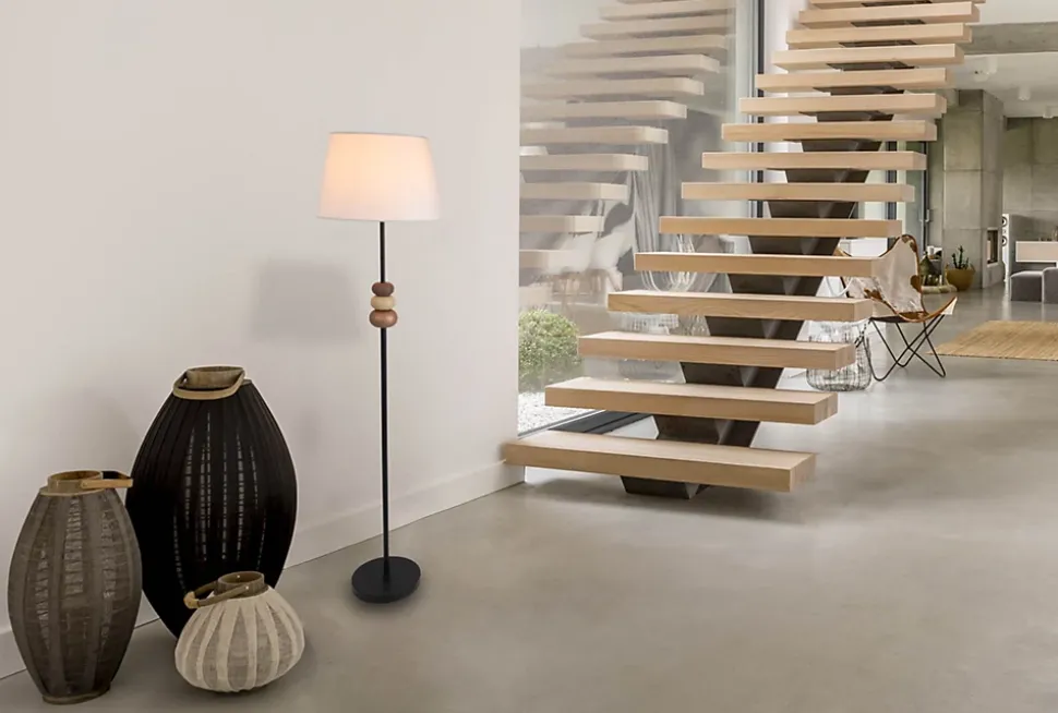 Le lampadaire de notre collection ELINA – un point fort pour votre intérieur Les lampadaires vous permettent d’aménager votre espace de manière individuelle, que ce soit comme élément décoratif, comme complément au style d’aménagement ou comme pièce de design remarquable. Grâce à leur faible encombrement, ils sont également parfaits pour les petites pièces ou les niches. Un aspect décoratif et une forme conique font de cette pièce de style naturel un must-have pour tous ceux qui aiment les intérieurs cohérents. La combinaison frappante de métal et de matériau textile noir fait de ce luminaire un véritable accroche-regard. La structure mate et l’abat-jour recouvert forment une unité parfaite. Le lampadaire mesure 38 cm de longueur, 38 cm de largeur/profondeur et 155 cm de hauteur. Le luminaire a donc un diamètre de 38 cm. Le lampadaire est équipé d’un interrupteur à pression et d’une fiche plate européenne. Avec une longueur de 180 cm, le câble noir offre suffisamment de marge de manœuvre. Avec ce lampadaire, apportez une lumière esthétique dans vos pièces à vivre. Équipé d’un culot G3, vous pouvez l’équiper à votre guise d’ampoules appropriées. Vous pouvez changer vous-même l’ampoule. Ce luminaire correspond à la classe 2. Une tension de réseau de 220-240V ~ 50Hz est nécessaire pour le fonctionnement sur secteur de cet appareil. Avec une puissance de 40 watts, ce luminaire est particulièrement puissant et efficace. Nos lampadaires de haute qualité assurent une ambiance lumineuse optimale et confèrent à votre intérieur confort et style dans chaque pièce.