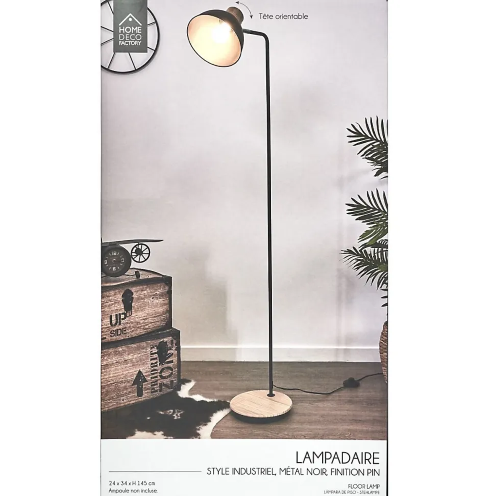 Aspect : Coloris = Noir • Matériau principal = Fer • Matériaux secondaires = Pin Ciment PVC • Dimensions : Hauteur (en cm) = 145 • Longueur (en cm) = 34 • Profondeur (en cm) = 24 • Autres caractéristiques : Informations complémentaires = Ampoule E27 non incluse , Alimentation prise secteur 220/240 , 25 watts max , Longueur du câble 1.80 m • Poids (en kg) = 2,54 • Lampadaire en métal noir 145 cm