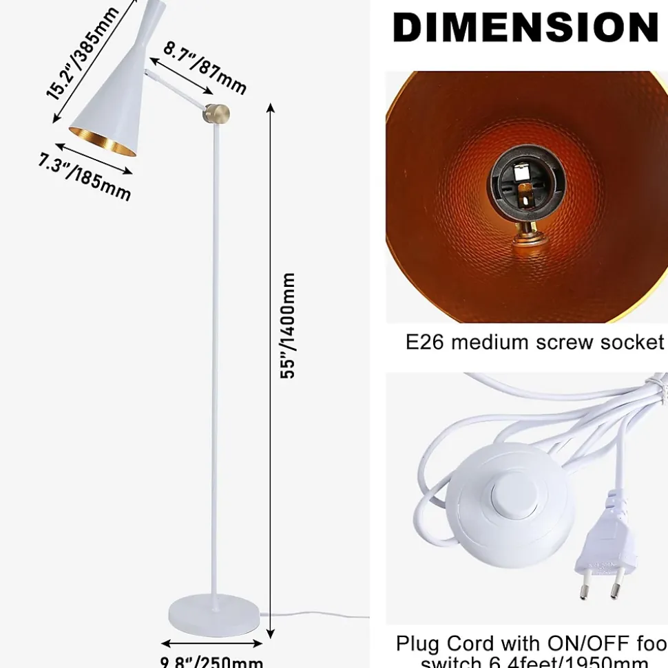 Lampadaire « ESTEFANIA » – Une pièce moderne et élégante en aluminium de haute qualité avec un design minimaliste et une finition laquée mate. Son style polyvalent et ses lignes épurées la rendent parfaite pour divers décors, tels que contemporain, industriel, rustique, vintage et mid-century. L’intérieur de l’abat-jour présente une finition bronze sophistiquée avec un motif en nid d’abeille, ajoutant une touche de chaleur et de distinction.Design et Fonctionnalité : Avec une base solide et contrebalancée pour une stabilité maximale, son abat-jour orientable et sa tête pivotante permettent un éclairage ciblé et ajustable selon vos besoins.Spécifications Techniques :Matériel : AluminiumCouleur : Noir matDouille : E27 (ampoule non incluse)Puissance : Maximum 40 WTension : 220-240V ACUsage Intérieur : IP20Dimensions : Ø 250 x 1670 mmCâble : 187 cm avec prise européenne standard et interrupteurIdéal pour la Maison : Parfaite pour créer une ambiance chaleureuse et moderne, « ESTEFANIA » est un élément décoratif élégant qui rehausse n’importe quel espace, que ce soit le salon, la chambre ou tout autre coin de la maison.Note : Ampoule non incluse.
