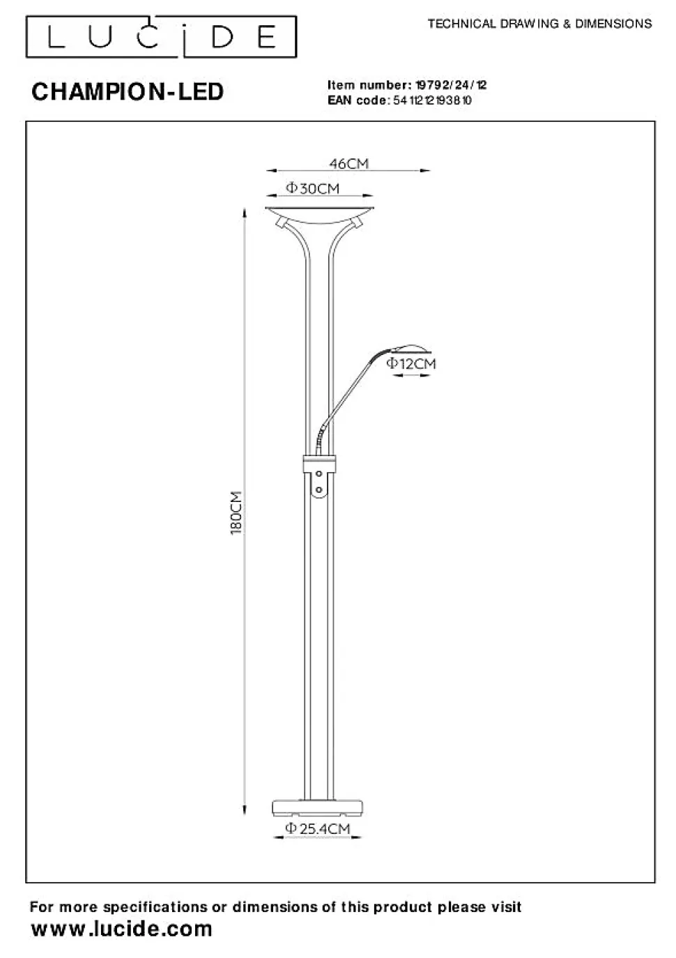 Champion LED est comme son nom l’indique, un champion dans le monde des lampadaires. La conception allongée s’étirera de tout son long votre salon ou chambre à coucher. Grâce aux deux points lumineux, un milieu et un en haut, vous pourrez profiter de deux fois plus d’ambiance dans la maison. Les avantages de cette lampe de lecture sont nombreux: un design unique avec un bras de lecture flexible et un éclairage LED. La lampe est pourvue de deux variateurs de lumière, ce qui vous permettra de régler la luminosité des deux lampes séparément. Grâce à son petit diamètre Champion LED saura trouver sa place dans tous les coins. Vous passerez de beaux moments de lecture sous la lumière chaude de ce lampadaire.Caractéristiques uniques:• Équipé d’une lampe LED intégrée à intensité variable• Dispose d’une lumière blanche chaude (3000K)• Avec un bras de liseuse flexible• Avec bouton d’intensité variable sur la lampe• Fabriqué en métalPrincipales caractéristiques du produit:• Consommation énergétique: 1x20W / 230V / A intensité variable (Ampoule incluse)• Dimensions: Ø30 cm Haut.180 cm• 3 Ans garantie sur le luminairePourquoi choisir l’éclairage Lucide?Lucide incarne un design innovant, un savoir-faire artisanal et une fiabilité exemplaire. En tant qu’entreprise familiale belge avec plus de trois décennies d’expertise, nous concevons des éclairages de haute qualité qui enrichissent et transforment chaque espace, tant intérieur qu’extérieur. Notre collection polyvalente comprend des luminaires durables et des sources lumineuses économes en énergie, soigneusement conçus par nos propres experts et fabriqués selon les normes CE les plus strictes. Grâce à notre large gamme, nous vous proposons toujours une solution d’éclairage adaptée, quel que soit le style ou l’espace. Ainsi, nous illuminons non seulement votre espace de vie mais aussi votre processus de choix dans la recherche d’un éclairage d…