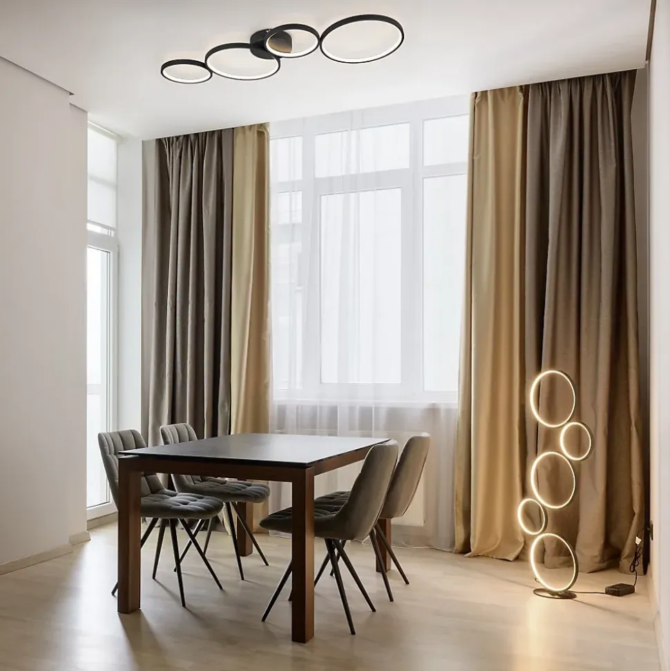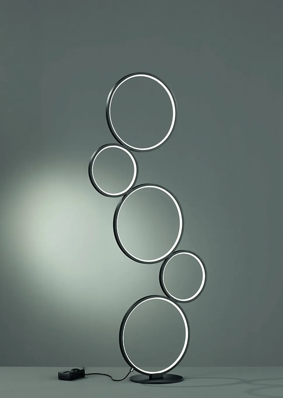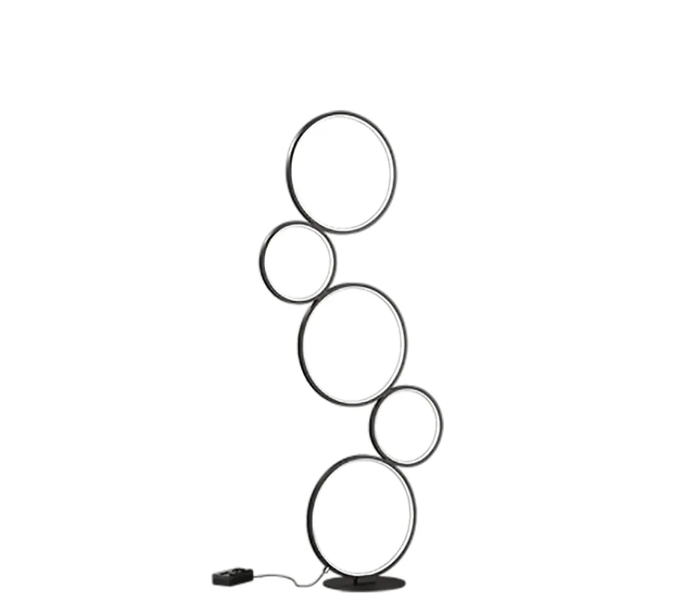 Les caractéristiques techniquesLe lampadaire Rondo de la marque Trio est équipé de LED SMD intégrées d’une puissance de 36W, diffusant une lumière chaude de 3000K et une intensité de 4700 lumens. Il est dimmbale grâce à un variateur intégré commandé directement par l’interrupteur à pied.Il offre ainsi un confort d’utilisation optimal pour adapter la luminosité selon vos envies ou vos besoins.Les avantages esthétiquesCe lampadaire se distingue par son design audacieux et moderne : cinq anneaux lumineux superposés de tailles différentes composent sa structure graphique. Il devient ainsi un véritable objet de décoration autant qu’un éclairage performant.Avec sa finition noir mat, il s’intègre parfaitement à des intérieurs contemporains ou minimalistes et devient un élément central dans un salon ou un bureau.
