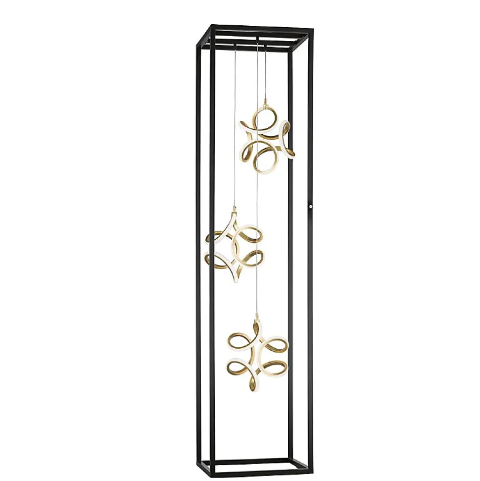 Les caractéristiques techniques Le lampadaire Led Gesa de chez Fischer & Honsel est un luminaire qui dispose de Led intégrées. Vous pourrez régler l’intensité lumineuse en continu.Les 5400 Lumens que diffuse cette lampe sur pied vous offriront une très belle lumière : idéal dans une grande pièce de vie, bureau ou open space.Vous disposerez d’une garantie de 7 ans pour les Leds, gage de sérieux et de qualité de la maison Fischer & Honsel.Les avantages esthétiques Ce lampadaire Led au design unique réunit efficacité et style. Cette lampe de sol allie le métal noir sablé pour la structure, la feuille d’or vieilli et le verre acrylique blanc pour les éléments lumineux accrochés par des câbles en métal tressé qui semblent flotter dans l’air.Atmosphère festive ou studieuse, reposante ou dynamisante, le fait d’être dimmable en continu permet à Gesa de réagir avec flexibilité à votre humeur ou à votre activité du moment !Salon, chambre, bureau, à vous de choisir ! Gesa trouvera facilement sa place partout chez vous.Grâce à ses possibilités de réglages et à son design minimaliste, elle s’adaptera parfaitement à l’emplacement que vous lui aurez choisi.La gamme Gesa vous propose aussi la lampe de table (ref 50323)