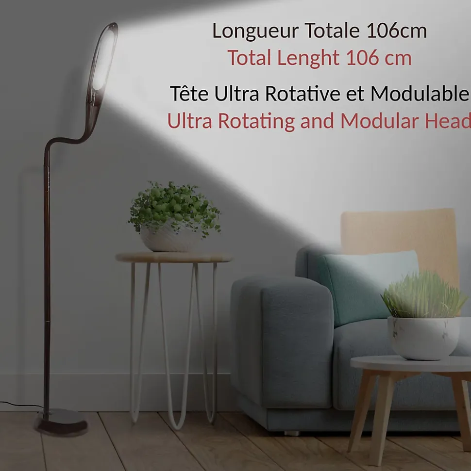 LAMPADAIRE DESIGN – Cette lampe de salon sur pied s’accordera parfaitement dans votre décoration d’intérieur et vous séduira avec ses fonctionnalités. Sa finition effet bois Wengé apporte une touche sobre et moderne. Idéal comme lampe de salon, salle à manger, lampe de bureau ou dans une chambre.LUMINOSITE REGLABLE – La lampe dispose d’une lumière LED réglable. Elle permet de choisir parmi 3 Températures de couleur : Lumière Naturelle + Blanc Froid + Blanc Chaud. Pour toutes les situations, la lampe dispose de 4 Niveaux d’intensité (25%, 50%, 75% et 100%) de 630 à 900 lumen et s’adapte à vos besoins.CONTRÔLE TACTILE – Le lampadaire LED dispose d’un contrôle tactile sur la colonne, Inutile de se baisser lorsque vous êtes sur votre canapé, il suffit d’éffleurer le manche d’une simple pression pour allumer / éteindre votre lampe (Bouton ON/OFF) et de sélectionner le mode voulu (Bouton Mode).TETE FLEXIBLE – La tête du lampadaire est ajustable et vous permet d’orienter la lumière dans toutes les directions. L’angle variable de 0 à 150° de haut en bas et tourner forizontalement sur 90°. Une fonction qui permet d’utiliser votre lampadaire comme lampe de lecture, liseuse ou lampe d’appoint pour vos activités.CARACTERISTIQUES – Dimensions : 22.5 x 18 x 160 cm – Matière Robuste : ABS, Aluminium, Silicone, PC, fer – Couleur : Imitation Wengé effet bois – Lumière LED 51 pièces – Intensité lumineuse: 630 à 900lm; Température de couleurs: 3000 à 6500K – Alimentation : Secteur DC 12V – Garantie 2 ans