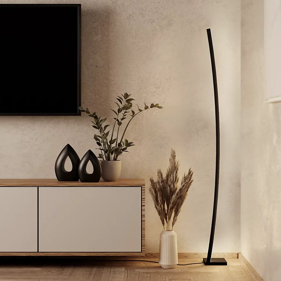 Le lampadaire LED PICACHA se compose d’une barre de LED légèrement incurvée en métal noir. Les LED intégrées sous la protection en plastique blanc diffusent une agréable lumière blanc chaud. Habilement placé dans un coin de la pièce, le lampadaire diffuse sa lumière contre le mur et crée ainsi un éclairage d’ambiance indirect. L’interrupteur à pied du câble permet de l’allumer et l’éteindre facilement. Ce lampadaire s’intègre parfaitement aux intérieurs modernes et offre un éclairage stylisé dans n’importe quelle pièce, que ce soit le salon, la chambre ou la salle à manger.