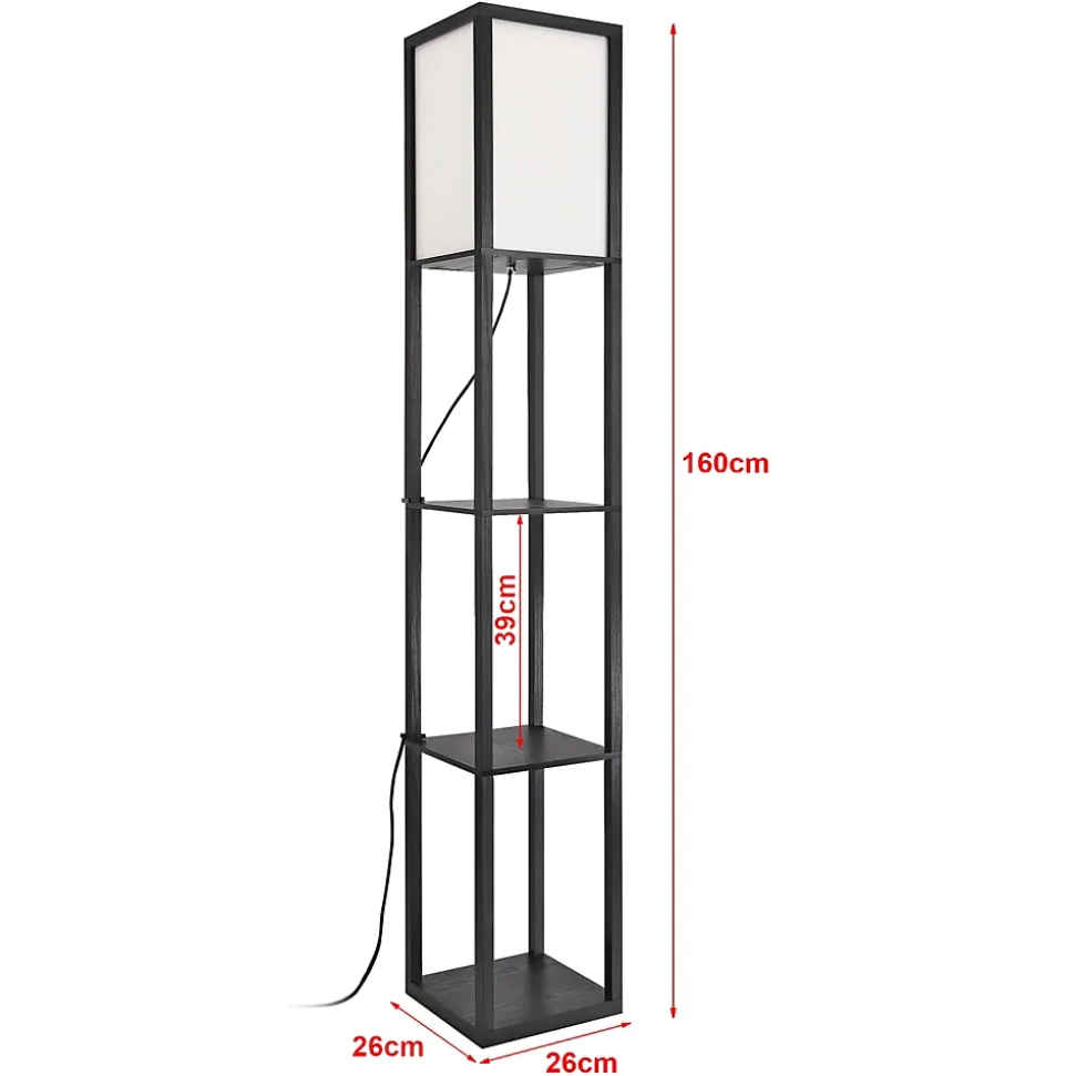 LampadaireCette lampe sur pied chic et moderne sera l’ornement de la pièce en s’adaptant à la décoration de la maison. A part l’éclairage, ce lampadaire offre 3 surfaces de rangement gâce à l’étagère intégrée.Description :- luminaire de design original- avec une étagère à 3 niveaux intégrée- conçu pour un éclairage intérieur- doté d’une douilleCaractéristiques :- douille : 1 x E27, max. 20W (sans ampoule)- alimentation : 230V, 50Hz- type d’interrupteur : sur câbleMatière :- structure : bois- abat-jour : plastiqueDimensions :- totales (hauteur x largeur x profondeur) : 160 x 26 x 26 cm- distance entre les niveaux d’étagère : 39 cm- longueur du câble : 180 cmCouleur :- structure : noir- abat-jour : blancContenu de la livraison :1 x lampadaire [l’ampoule ne fait pas partie de l’offre]Produit de la marque :[lux.pro]