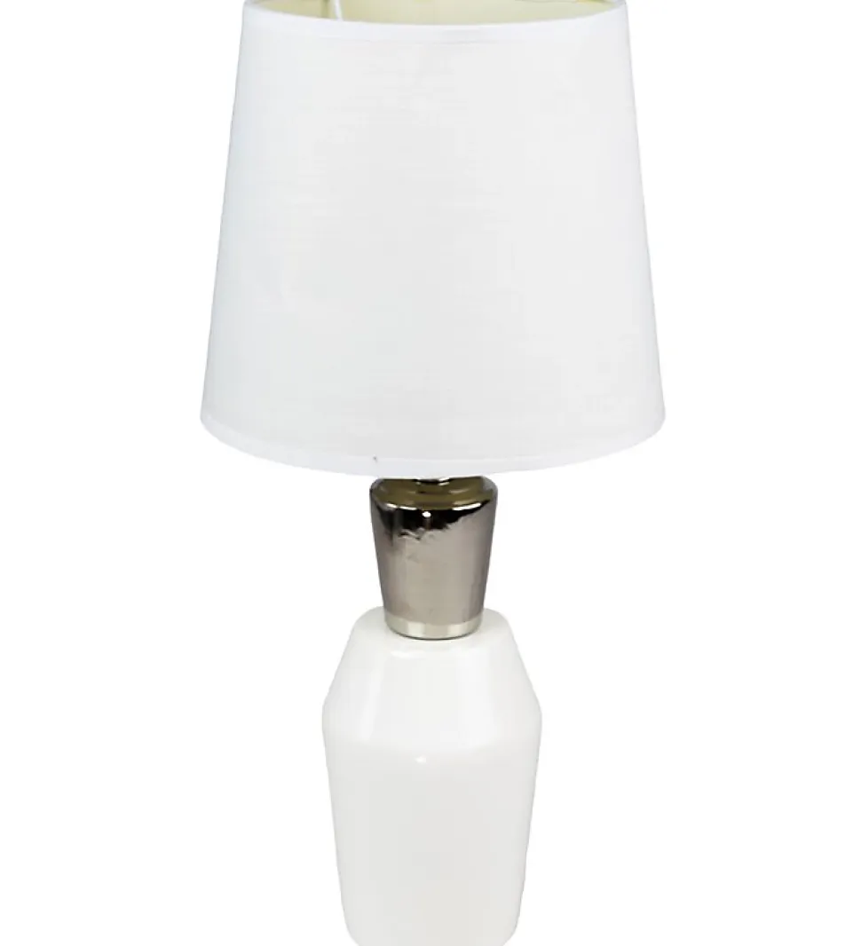 Petite lampe à poser pied céramique blanc et argent et abat-jour tissuCompatible ampoules LED (Ampoule basse consommation fournie)Descriptif :Couleur : noir et argentMatériau : Pied en céramique, Abat-jour en tissuUsages spécifiques : Usage intérieur uniquementDiamètre abat-jour : 20 cmHauteur Abat-jour : 18 cmHauteur totale (socle et abat-jour) : 44 cmCaractéristiques techniques :Type d’ampoule compatible : LED, Halogène, Fluo compacteType de culot : E14Puissance : 40 WattsAmpoule incluse : OuiVolt : 230Branchement : prise secteurType d’interrupteur : Bouton basculeOptez pour cette petite lampe à poser en céramique dont le design sobre mais élégant s’adaptera à tous les styles d’intérieur.D’une hauteur total de 44 cm, cette lampe à poser conviendra à la décoration de votre salon ou de votre chambre comme lampe de chevet.L’utilisation d’un luminaire adapté aux ampoules LED vous permettra de réaliser des économies d’énergie