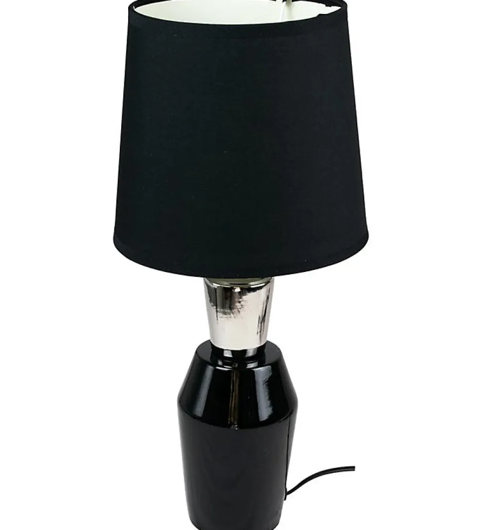 Petite lampe à poser pied céramique noir et argent et abat-jour tissuCompatible ampoules LED (Ampoule basse consommation fournie)Descriptif :Couleur : noir et argentMatériau : Pied en céramique, Abat-jour en tissuUsages spécifiques : Usage intérieur uniquementDiamètre abat-jour : 20 cmHauteur Abat-jour : 18 cmHauteur totale (socle et abat-jour) : 44 cmCaractéristiques techniques :Type d’ampoule compatible : LED, Halogène, Fluo compacteType de culot : E14Puissance : 40 WattsAmpoule incluse : OuiVolt : 230Branchement : prise secteurType d’interrupteur : Bouton basculeOptez pour cette petite lampe à poser en céramique dont le design sobre mais élégant s’adaptera à tous les styles d’intérieur.D’une hauteur total de 44 cm, cette lampe à poser conviendra à la décoration de votre salon ou de votre chambre comme lampe de chevet.L’utilisation d’un luminaire adapté aux ampoules LED vous permettra de réaliser des économies d’énergie