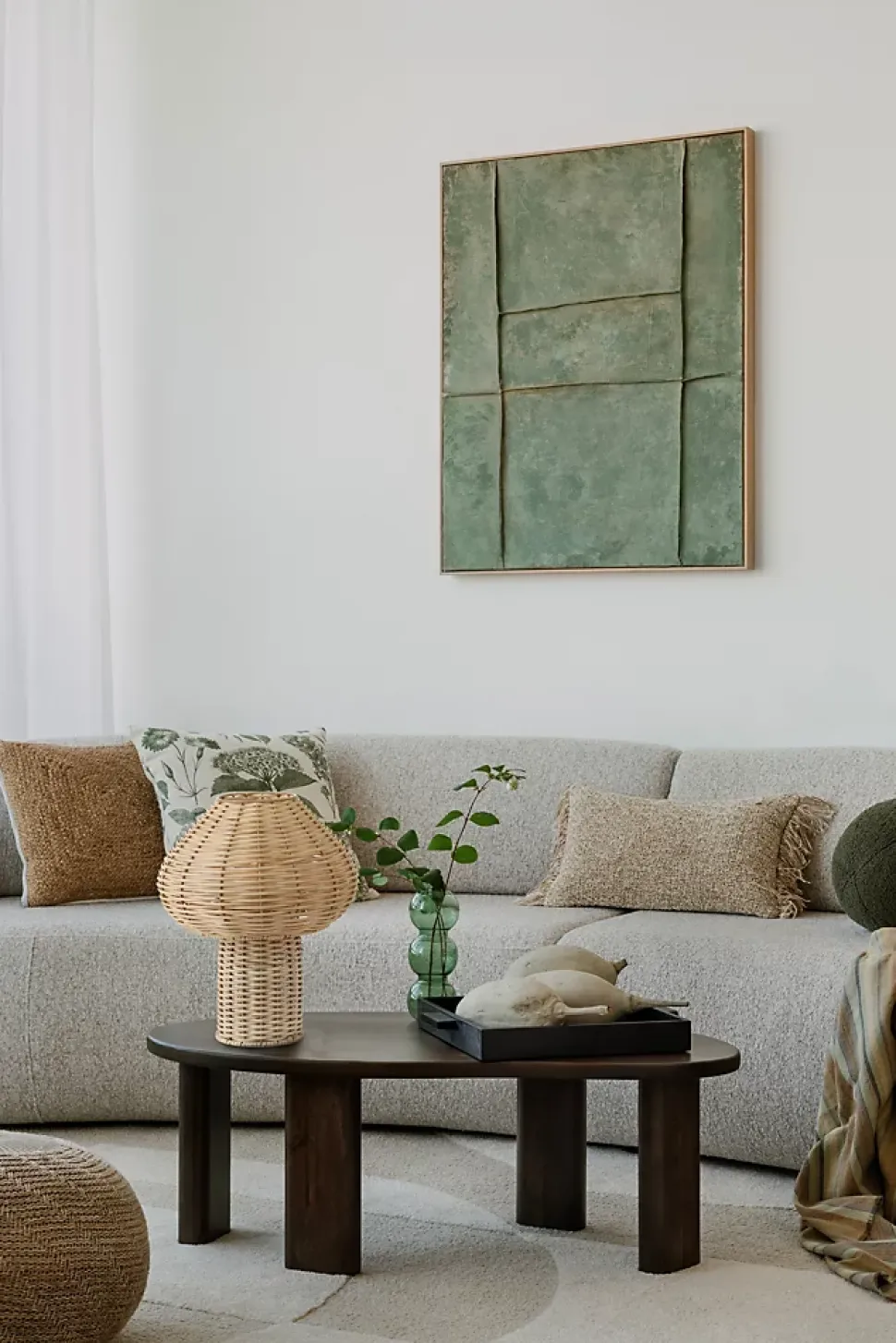 - Une lampe en rotin en forme de champignon qui diffuse une lumière douce et chaleureuse, parfaite pour une ambiance cosy et naturelle.