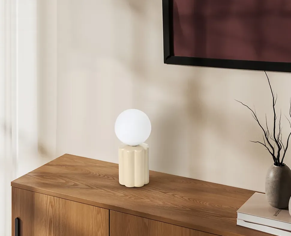 - Un pied en céramique écru et un globe en verre opalin pour une lampe au design épuré et intemporel.