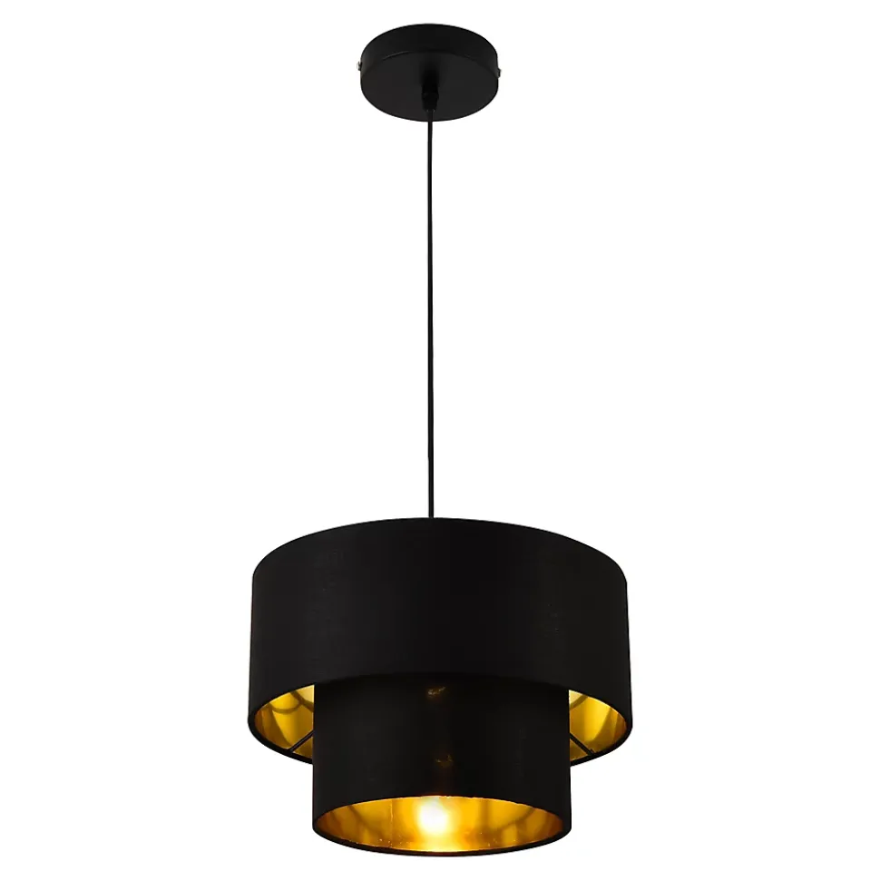 Suspension design Gâce à son apparance stylée, cette lampe à suspendre élégante et moderne embellira votre maison. Description : – suspension moderne et stylée pour l’intérieur – forme design – éclairage efficace Alimentation : 230V, 50Hz Type d’interrupteur : mural Douille : E27, max. 60W (le paquet à livrer ne contient pas d’ampoule)Matière : élément de fixation : métal l’abat-jour : textileCouleur : noir à l’extérieur, doré à l’intérieurDimensions : hauteur : ca. 149 cm avec le câble longueur du câble : ca. 125 cmdiamètre de l’abat-jour : ca. 30 cmdiamètre de l’élément de fixation au plafond : ca. 12 cm Contenu de la livraison : 1 x lampe à suspendre [sans ampoule] Produit de la marque [lux.pro].