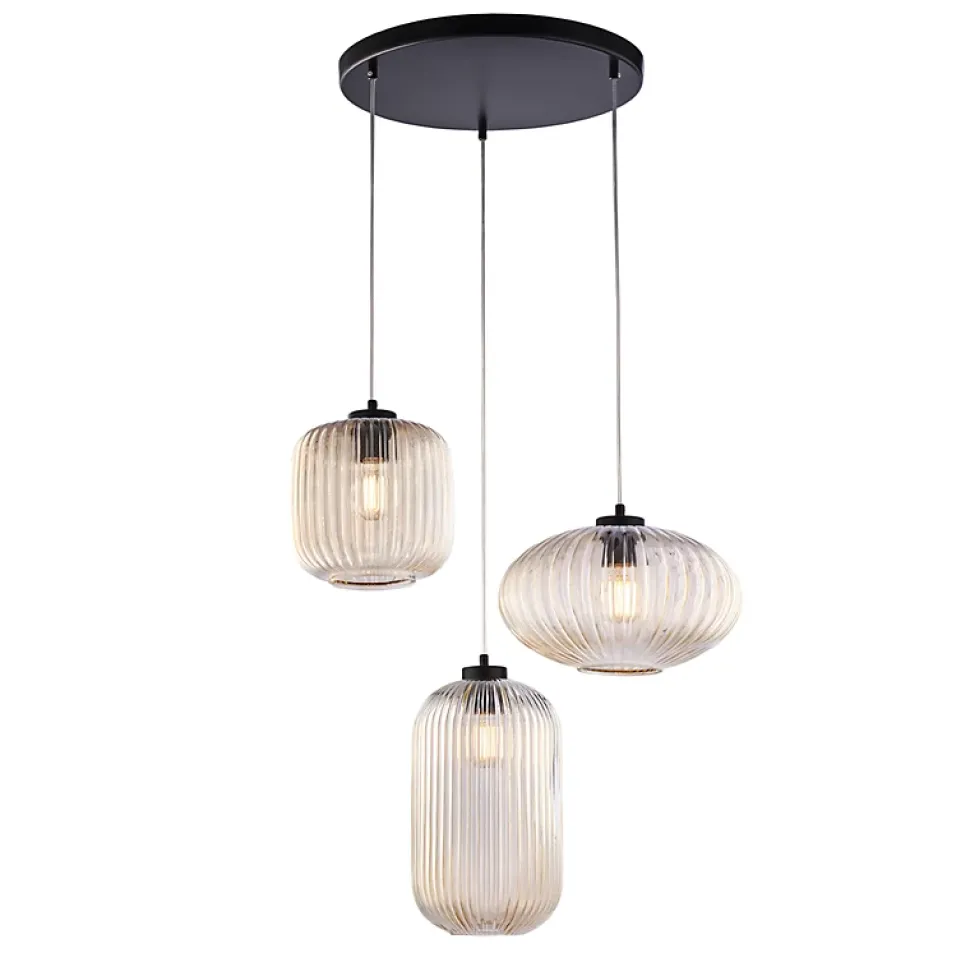 Lampe à suspension en fer laqué noir avec câbles électriques orientables et diffuseurs en verre soufflé ambré à décor rayé en relief, 3 lumières – H.41 – MAX 141 – Ø55 Mesures du produit : H