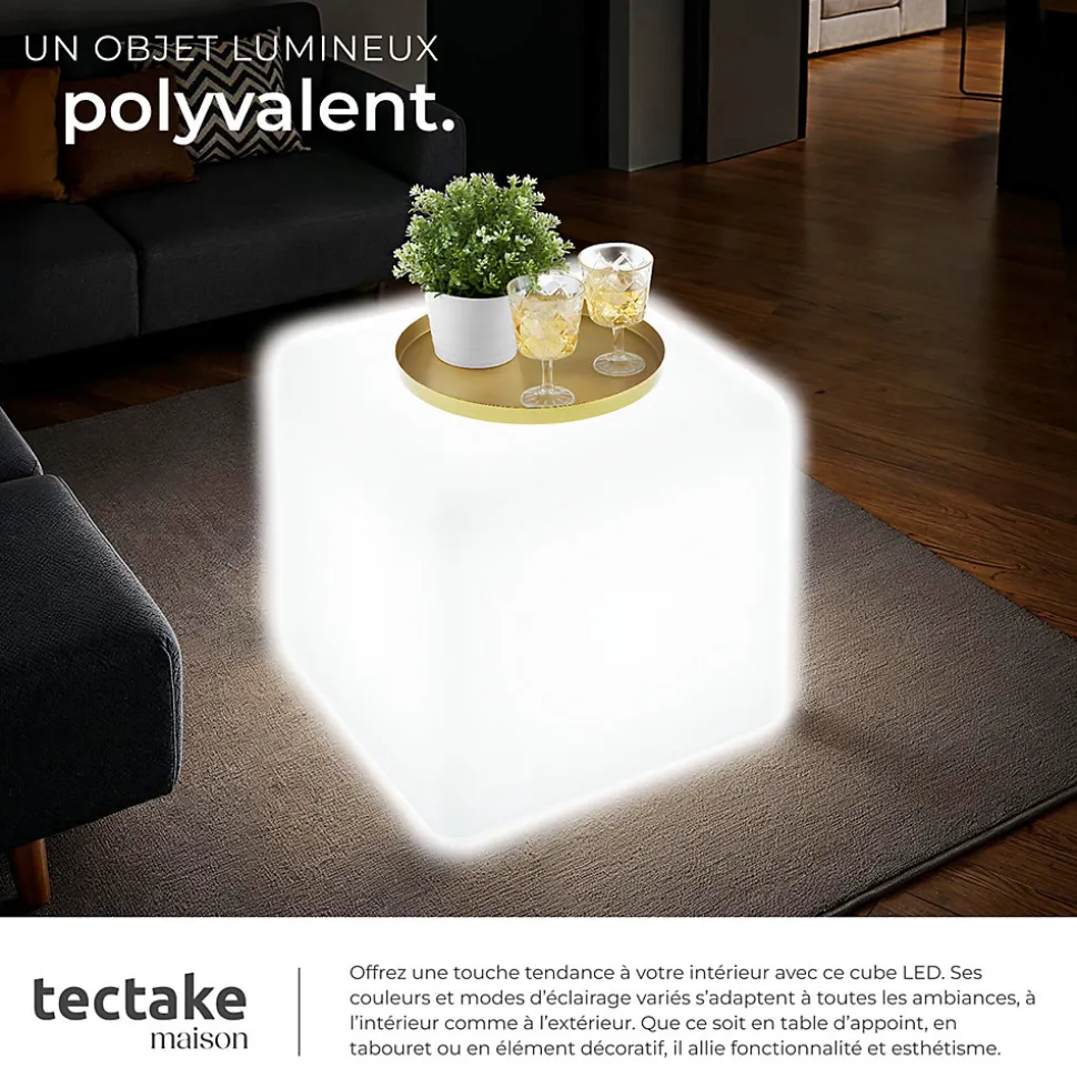Un élément éclatantApportez une mise à niveau éclatante à votre jardin, votre terrasse ou votre balcon avec le cube lumineux stylé Luminous Cube de tectake. Grâce à son design simple mais élégant, il s’intègre parfaitement dans n’importe quel environnement – que ce soit comme élément de décoration moderne, table d’appoint pratique ou tabouret compact.Une ambiance personnalisableDécouvrez un jeu de lumières fascinant avec 16 couleurs RGB et 5 modes d’éclairage différents, qui se contrôlent facilement grâce à la télécommande fournie. Choisissez un blanc subtil ou un bleu intense, des couleurs statiques ou plusieurs couleurs changeantes en mode stroboscope sauvage ou en mode slow-motion doux. Une fabrication solideLe boîtier robuste de la lampe d’extérieur en polyéthylène résistant aux intempéries résiste efficacement au soleil, à la pluie ou au gel et est idéal pour une utilisation tout au long de l’année. De plus, le compartiment pratique assure que le câble est protégé de l’eau. Une stabilité absolue est garantie par les 4 pieds solides ou, alternativement, par le piquet de terre fourni.Créez une ambiance de rêve dans votre espace extérieur avec le cube lumineux tendance Luminous Cube de tectake !