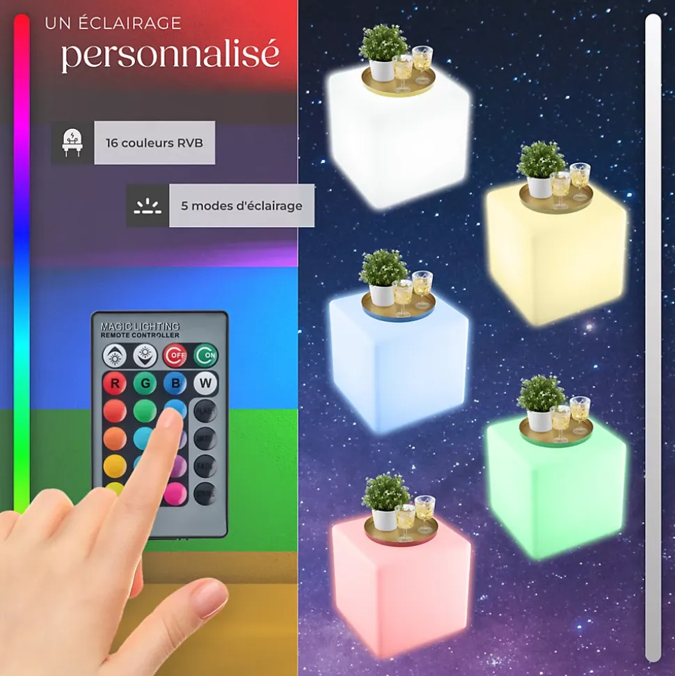 - Points Forts:Lampe cube LED élégant avec 4 pieds et éclairage doux16 couleurs RGB et 5 modes d’éclairage pour chaque ambianceBoîtier robuste et résistant aux intempéries en polyéthylèneUtilisation polyvalente, par exemple comme table d’appoint ou tabouretCompartiment pratique pour le rangement des câblesTélécommande, ampoule et piquet de terre inclus