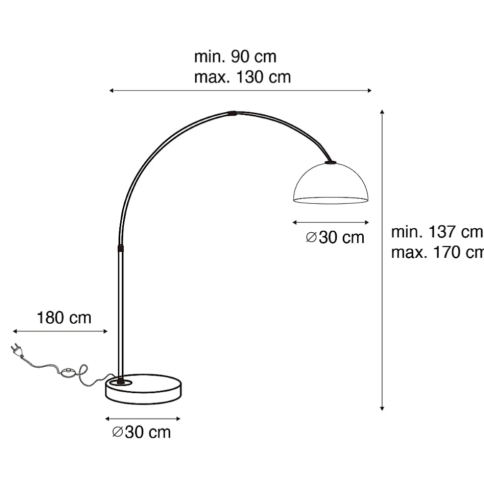 Ce lampadaire d’arc moderne Arc Basic est un véritable créateur d’ambiance dans votre intérieur ! C’est une lampe d’arc intemporelle avec un abat-jour en plastique blanc opale. Une lampe d’arc offre à la fois un éclairage fonctionnel et d’ambiance dans le salon. Cette lampe est réglable en hauteur de 170 cm à 150 cm, a une longueur de 120 cm et une largeur de 30 cm. L’abat-jour a une hauteur de 20 cm et un diamètre de 30 cm. L’arc est réglable à deux endroits, vous pouvez donc déterminer vous-même la hauteur et l’envergure. La base a un diamètre de 30 cm et une hauteur de 4,5 cm. Le cordon mesure 180 cm de long. La lampe est livrée avec une ampoule A60 Wifi. Celle-ci peut être facilement contrôlée depuis votre smartphone, votre tablette ou votre assistant domestique. Vous pouvez également l’atténuer dans l’application. Créez une atmosphère agréable avec la lampe d’arc Arc Basic !