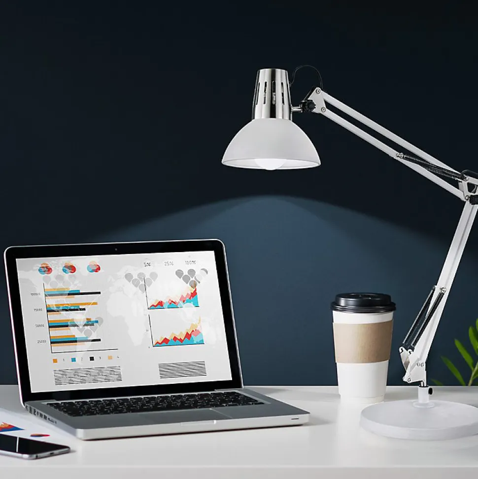 Les caractéristiques techniquesCette lampe de bureau est en métal blanc mat et chromé .Elle offre deux possibilités d’installation : lampe à poser sur son socle ou lampe à fixer sur le rebord d’un bureau ou d’une table grâce à son système de pince à visser.Elle fonctionne avec une ampoule E27, non fournie ce qui vous permet de choisir température de couleur et intensité lumineuse en fonction de vos goûts et besoins.Les avantages esthétiquesVous serez séduit par l’esthétique classique de la Lampe de bureau Pit de chez Fischer & Honsel.Avec son esthétique type lampe d’architecte et son support articulé sur 3 axes, elle s’harmonisera avec une décoration contemporaine épurée.Pit existe en noir, blanc ou gris.