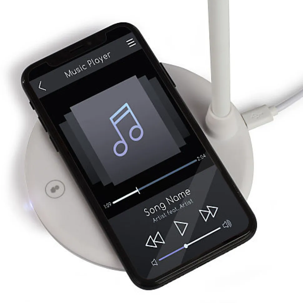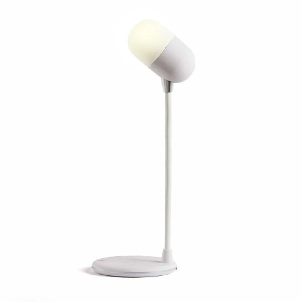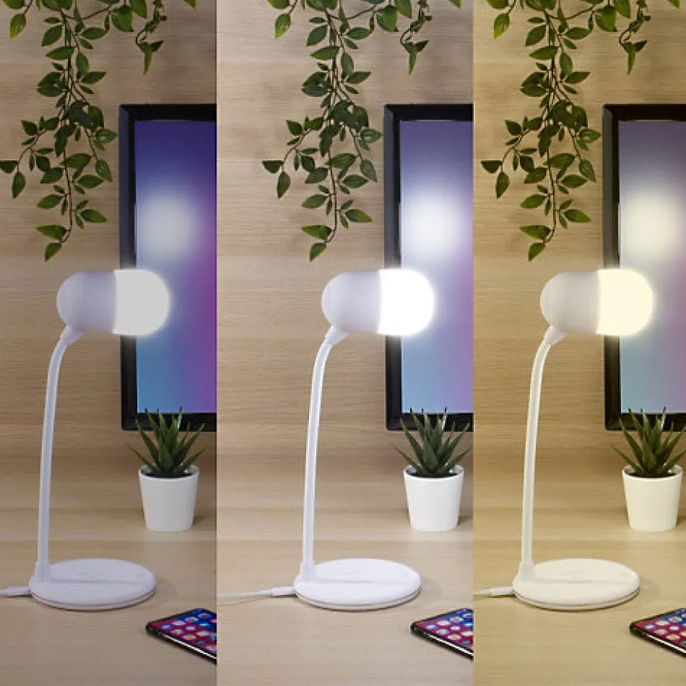 Ping vous propose :Une lampe ultra déco et multifonction.Avec ses 14 LEDs intégrées, vous aurez une lumière intense pour une consommation électrique très faible. Il vous sera non seulement possible de régler l’intensité lumineuse grâce au variateur intégré, mais également de choisir entre lumière blanche du jour pour un effet naturel, blanc neutre pour la consommation ou blanc chaud pour une ambiance agréable.La tête de la lampe, maintenue par un pied en silicone, est réellement orientable à 360° horizontalement et 180° verticalement.Mais profitez également d’une seconde fonction particulièrement pratique, un chargeur à induction pour votre mobile personnel.Cette lampe est compatible avec tous les mobiles (ANDROID et APPLE) et appareils certifiés QI.Précision = Les Iphone 12 et supérieurs ne fonctionnent pas sur ce dispositif.Enfin, une autre fonction cachée = haut-parleur sans fil via le système Bluetooth !Un vrai trésor lumineux de technologie ! Les plus du produit :- Lampe avec stat