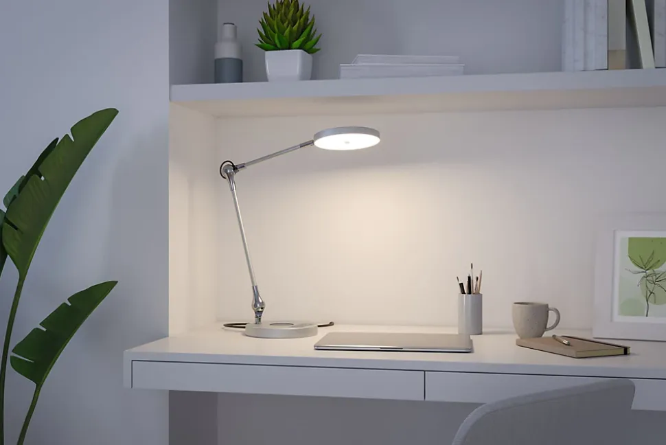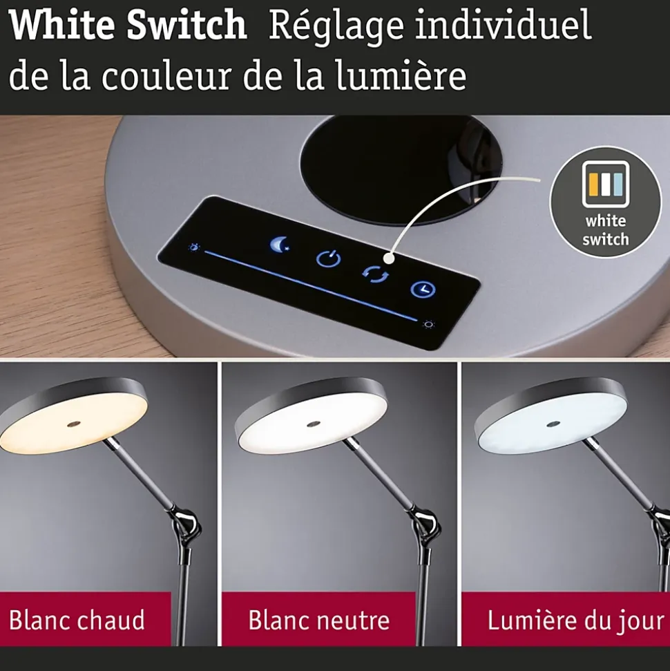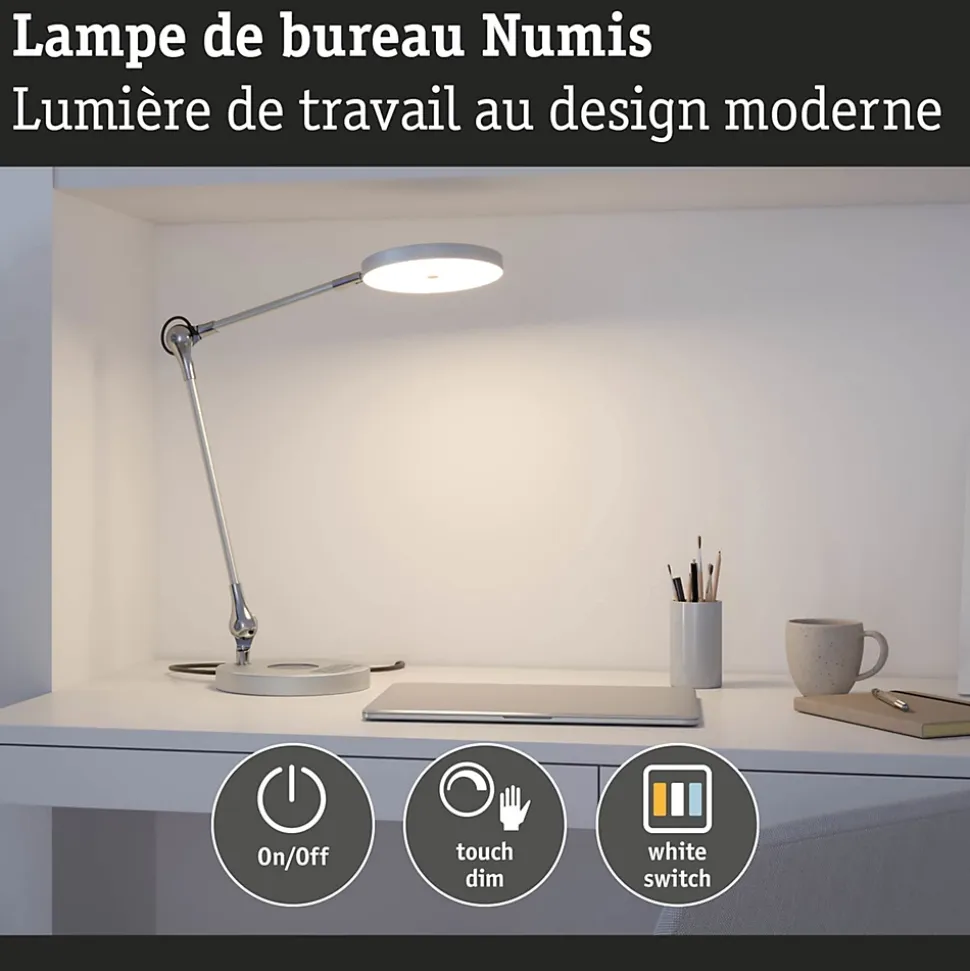 Le luminaire de bureau Numis est polyvalent ! Son coloris Argent intemporel est très beau sur un bureau. Sa position peut être précisément définie à l’aide des deux articulations. Sur le pied du luminaire se trouvent plusieurs commandes, dont la gradation en continu de la lumière ainsi que le choix entre blanc chaud et blanc lumière du jour.