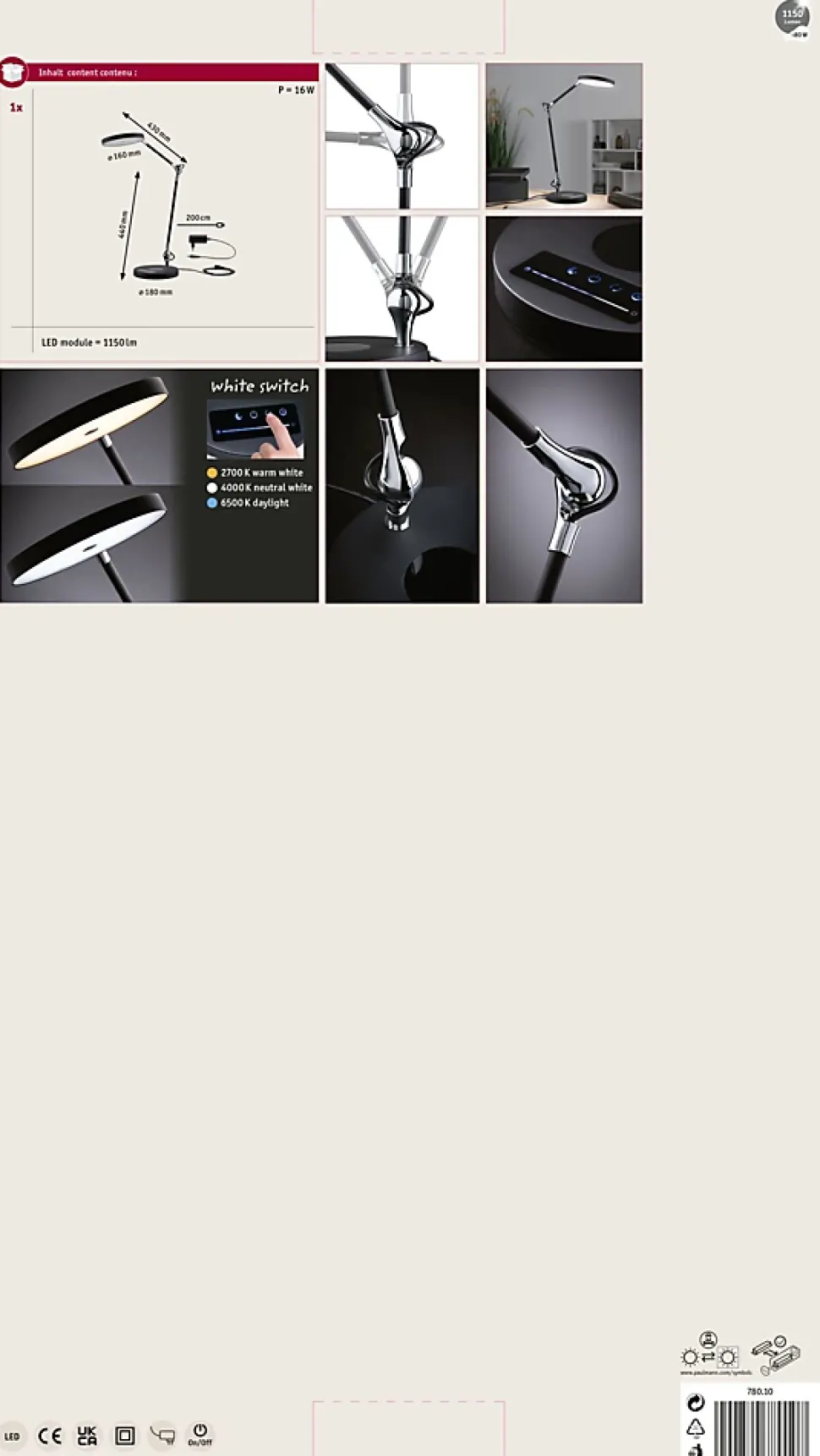Réglage personnalisé grâce aux deux articulations.|Avec ampoule LED intégrée|Température de couleur: 2700K Blanc chaud – 6500K – Lumière du jour|Gradable en continu|Incluant rallonge avec adaptateur