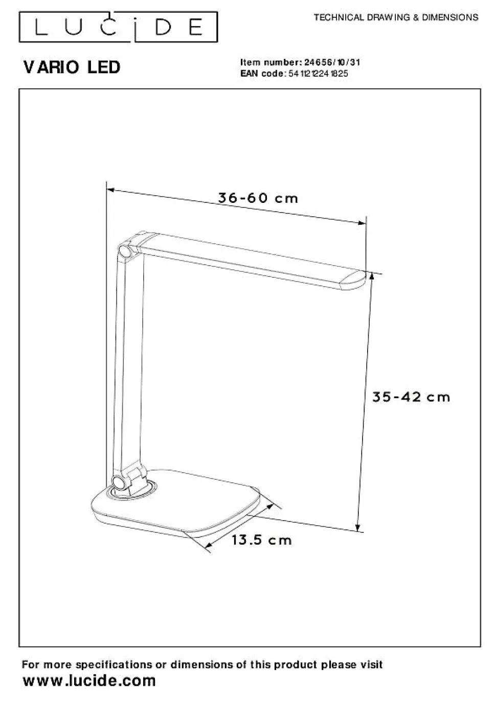 Cette lampe de bureau Vario LED saura décorer votre bureau de travail ou d’étude. Travaillez ou étudiez avec cette sculpture contemporaine blanche. Vario LED est polyvalente. L’ampoule LED intégrée joue avec une température de couleur qui varie de 2700 K à 6500 K. Vous préférez ne pas compter en Kelvin? Choisissez alors l’un des paramètres prédéfinis, tels que ‘lecture’, ‘nuit’, le ‘travail’ ou ‘ détente’. Pure facilité d’utilisation tout en étudiant. Rapprochez le cou flexible et travaillez d’une manière encore plus concentrée.Caractéristiques uniques:• Équipé d’une lampe LED intégrée à intensité variable• Température de couleur réglable via contrôle tactile par étapes sur le produit (2700K-6500K)• Cette lampe est rotative et inclinable• Avec capteur tactile sur la lampe à intensité variable• Fabriqué en métalPrincipales caractéristiques du produit:• Consommation énergétique: 1x8W / 230V / A intensité variable (Ampoule incluse)• Dimensions: Lon.13,5 x Larg.60 x Haut.42 cm• 3 Ans garantie sur le luminairePourquoi choisir l’éclairage Lucide?Lucide incarne un design innovant, un savoir-faire artisanal et une fiabilité exemplaire. En tant qu’entreprise familiale belge avec plus de trois décennies d’expertise, nous concevons des éclairages de haute qualité qui enrichissent et transforment chaque espace, tant intérieur qu’extérieur. Notre collection polyvalente comprend des luminaires durables et des sources lumineuses économes en énergie, soigneusement conçus par nos propres experts et fabriqués selon les normes CE les plus strictes. Grâce à notre large gamme, nous vous proposons toujours une solution d’éclairage adaptée, quel que soit le style ou l’espace. Ainsi, nous illuminons non seulement votre espace de vie mais aussi votre processus de choix dans la recherche d’un éclairage de qualité et abordable. Chez Lucide, nous combinons innovation et savoir-faire pour un éclairage qui ajo…