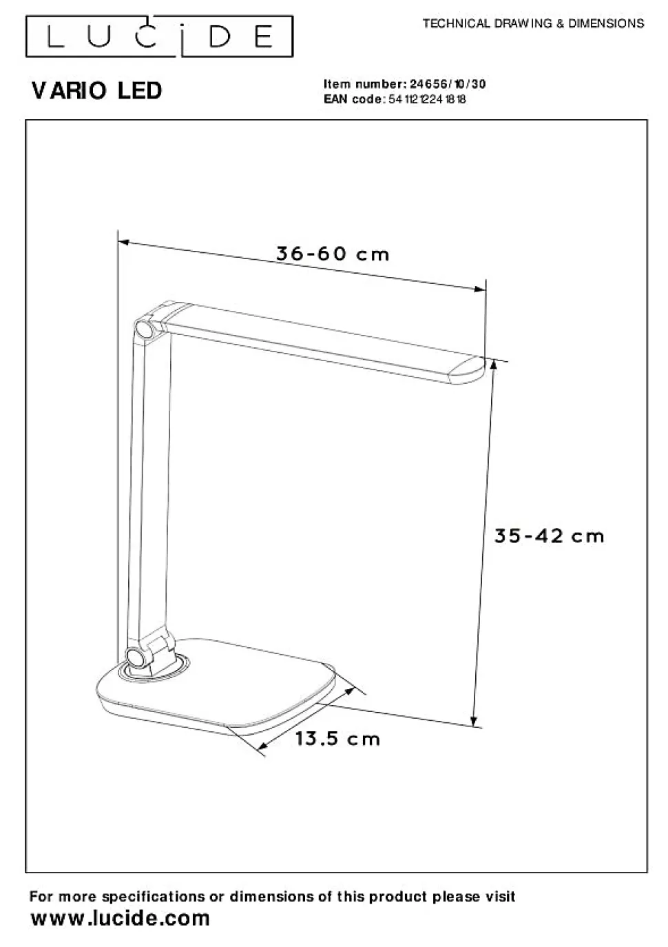 Un éclairage de bureau multifonctionnel et futuriste. Ce Vario LED de Lucide est une vraie soucoupe volante pour votre bureau ou espace de travail. De plus, c’est vous qui tenez les rênes: grâce au gradateur de lumière intégré, vous choisissez vous-même l’intensité de l’éclairage. D’un mouvement de doigt, vous passez du mode «read» à «night». L’ampoule LED intégrée est de 2700 K jusqu’à 6500 K pour un environnement d’étude approprié. Vous souhaitez éclairer un chapitre spécifique? Rapprochez le bras flexible de Vario LED plus près. Grâce à ce luminaire élégant et contemporain, vous étudierez ou travaillerez toujours de manière tendance et durable.Caractéristiques uniques:• Équipé d’une lampe LED intégrée à intensité variable• Température de couleur réglable via contrôle tactile par étapes sur le produit (2700K-6500K)• Cette lampe est rotative et inclinable• Avec capteur tactile sur la lampe à intensité variable• Fabriqué en métalPrincipales caractéristiques du produit:• Consommation énergétique: 1x8W / 230V / A intensité variable (Ampoule incluse)• Dimensions: Lon.13,5 x Larg.60 x Haut.42 cm• 3 Ans garantie sur le luminairePourquoi choisir l’éclairage Lucide?Lucide incarne un design innovant, un savoir-faire artisanal et une fiabilité exemplaire. En tant qu’entreprise familiale belge avec plus de trois décennies d’expertise, nous concevons des éclairages de haute qualité qui enrichissent et transforment chaque espace, tant intérieur qu’extérieur. Notre collection polyvalente comprend des luminaires durables et des sources lumineuses économes en énergie, soigneusement conçus par nos propres experts et fabriqués selon les normes CE les plus strictes. Grâce à notre large gamme, nous vous proposons toujours une solution d’éclairage adaptée, quel que soit le style ou l’espace. Ainsi, nous illuminons non seulement votre espace de vie mais aussi votre processus de choix dans la recherche…