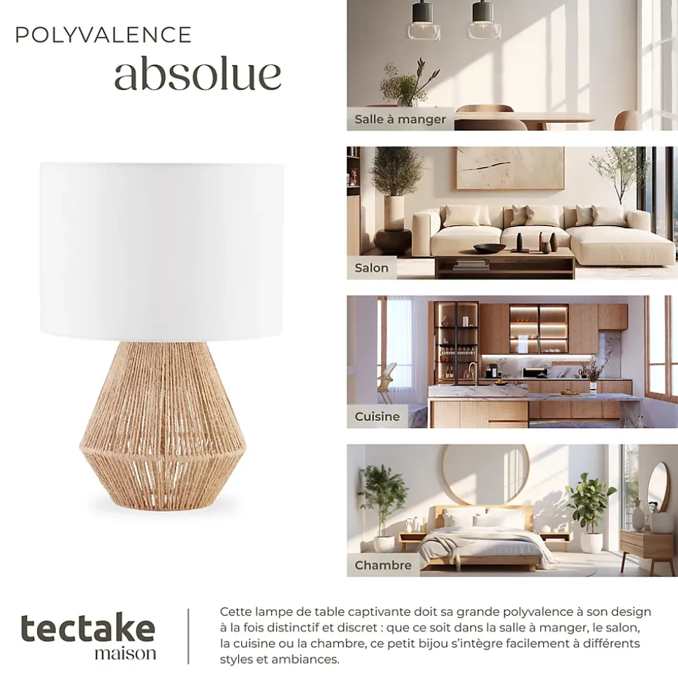 Un éclairage de caractèreApportez une touche de charme bohème à votre intérieur avec la lampe de chevet Lignea Lux de tectake. Avec son design raffiné et sa lumière douce non éblouissante, elle crée une atmosphère chaleureuse dans chaque pièce : que ce soit dans le salon, la chambre ou le bureau.L’harmonie entre naturel et éléganceFabriquée avec soin, Lignea Lux combine des matériaux chaleureux et des lignes épurées. Son pied stable, habillé de fibres de jute fines, offre un rendu artisanal et authentique, tandis que l’abat-jour rond complète parfaitement l’ensemble en diffusant une lumière agréable et homogène.Pratique et fonctionnelleDotée d’un câble long pour une installation flexible, cette lampe de chevet s’adapte facilement à vos besoins. Son interrupteur à bascule discret et pratique assure une utilisation simple et confortable : idéale pour la lecture, la détente ou vos soirées cocooning.La lumière d’un style naturelAlliez fonctionnalité, esthétique et ambiance apaisante avec la lampe de chevet Lignea Lux : une véritable pièce maîtresse pour un intérieur inspiré et chaleureux.