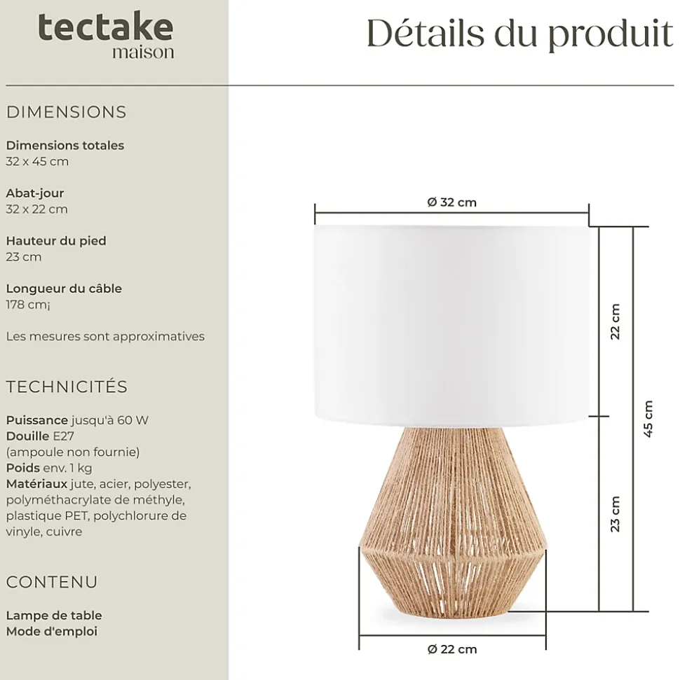 - Caractéristiques techniques:Dimensions totales (ØxH) : env. 32 x 45 cmPied (ØxH) : env. 22 x 23 cmAbat-jour (ØxH) : env. 32 x 22 cmLongueur du câble : env. 178 cmPuissance : jusqu’à 60 WRaccordement AC : 220 – 240VDouille : E 27Source lumineuse incluse : nonIndice de protection : IP20Poids : env. 0,9 kgMatériaux : jute, acier, polyester, polyméthacrylate de méthyle, plastique PET, polychlorure de vinyle, cuivre