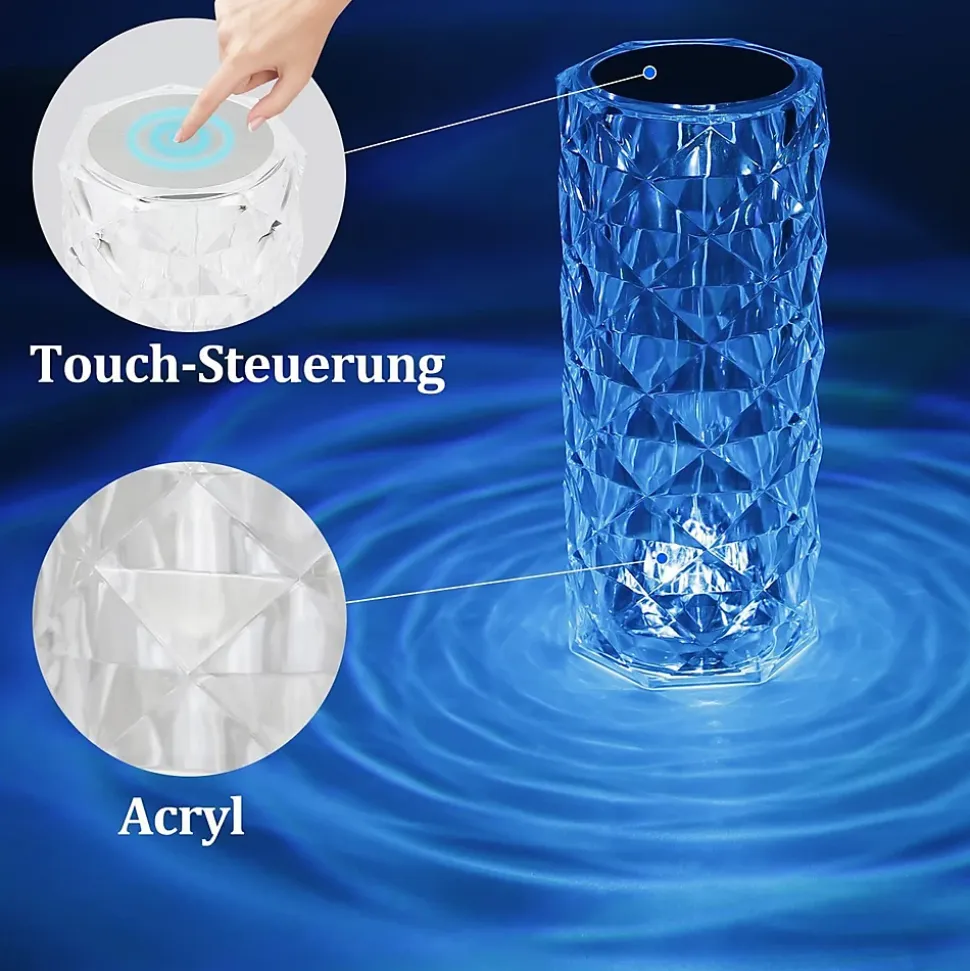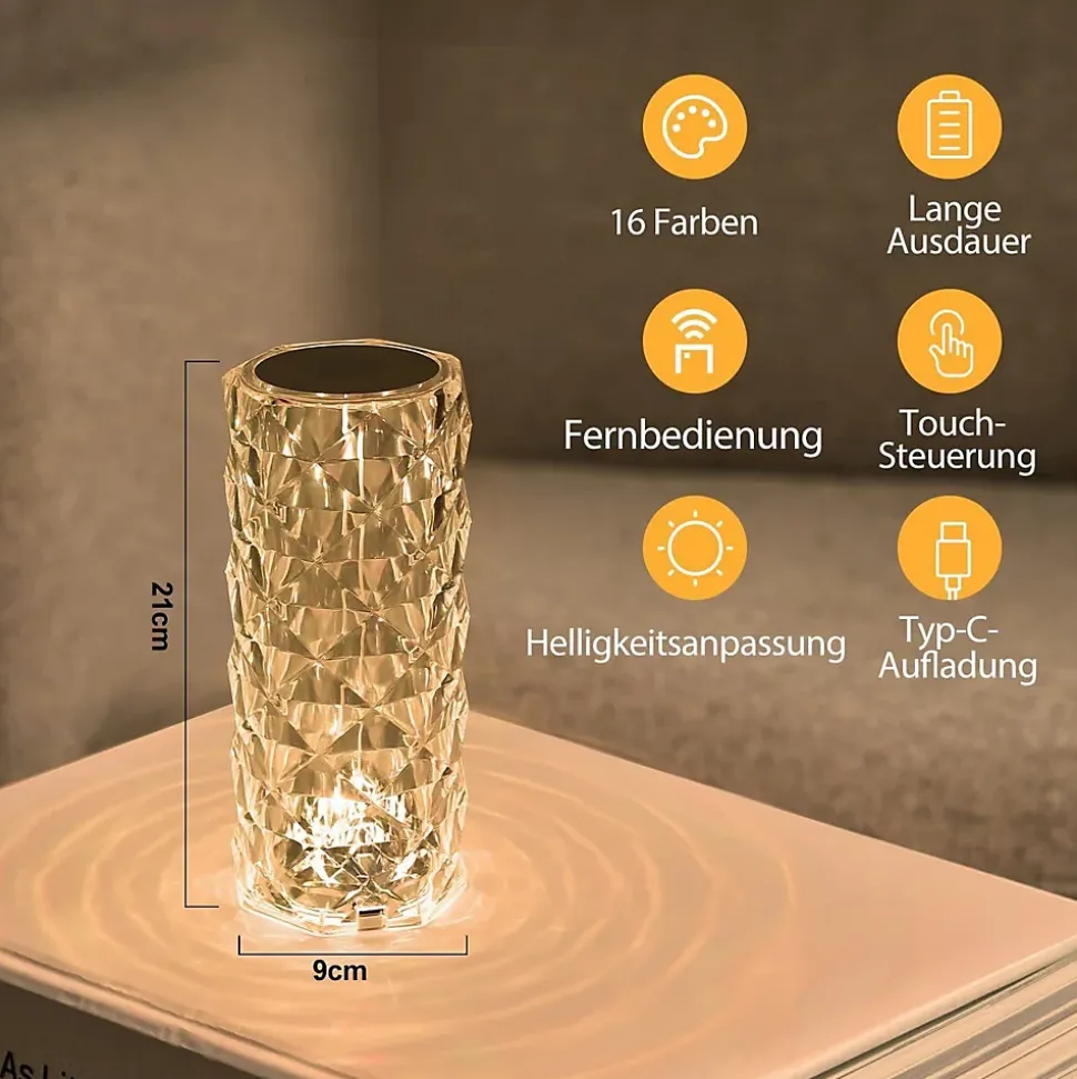 [Lampe de table en cristal au design scintillant] Cette lampe de chevet à changement de couleur s’inspire du design d’un diamant et est fabriquée en PC et en acrylique transparent.[16 couleurs de lumière changeantes à volonté] Cette lampe en cristal RVB réfractive est lumineuse et colorée, et offre jusqu’à 16 couleurs de lumière.[Télécommande et commande tactile] Maintenez le bouton enfoncé pendant trois secondes pour modifier la luminosité. Avec 24 boutons, le changement de couleur ne prend que 0,001 seconde.[Lampe de table avec port de charge USB] La lampe de bureau RVB est équipée d’une batterie intégrée de 700 mAh et d’un chargeur USB avec dispositif de protection.[Cadeau idéal] Idéale pour les anniversaires, Noël ou la Saint-Valentin, elle constitue également une surprise romantique pour les enfants, les amoureux ou les amis.:
