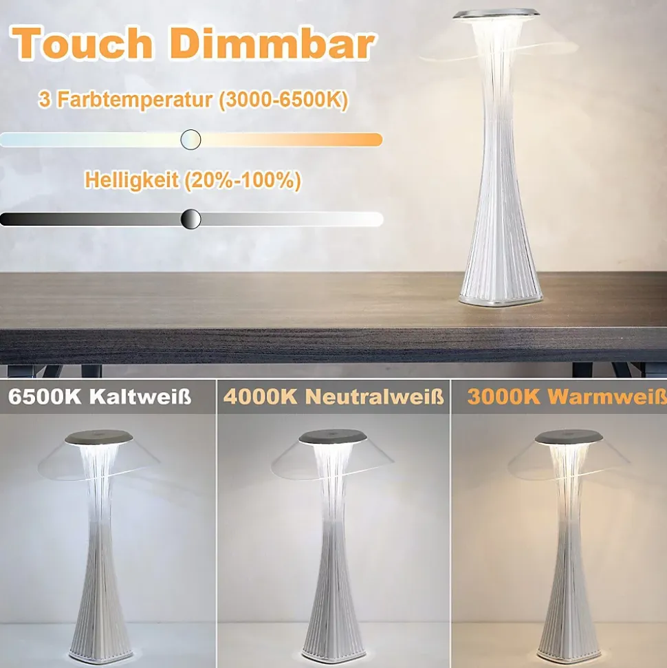 Design unique : cette lampe de table LED séduit par sa forme géométrique moderne qui sublime n’importe quelle pièce. Que ce soit dans la chambre, le bureau ou le salon, elle s’adapte parfaitement à tous les styles d’intérieur et souligne votre personnalité. Intensité variable : cette lampe permet un réglage continu de la température de couleur de 3 000 K à 6 500 K et un réglage continu de la luminosité. Une simple pression sur un bouton sur le dessus suffit pour passer du jaune chaud au blanc éclatant et ajuster la luminosité selon vos besoins : l’éclairage parfait pour chaque ambiance. Sans fil et longue durée de vie : la batterie intégrée de 1 200 mAh vous libère des câbles et vous offre une expérience utilisateur flexible et sans fil. Le port de charge USB permet une charge facile et pratique. Matériau de haute qualité : cette lampe de table est fabriquée en ABS de haute qualité, robuste, durable et sûr. Dimensions : 15,1 x 15,1 x 27,4 cm. Disponible en blanc classique et en or pour répondre à vos besoins individuels. Cette lampe de table LED 3 W est économe en énergie et extrêmement durable. Applications polyvalentes : cette lampe de table LED convient à une variété d’applications, telles que les chambres, les bureaux, les salons ou les salles d’étude, offrant une expérience d’éclairage agréable.