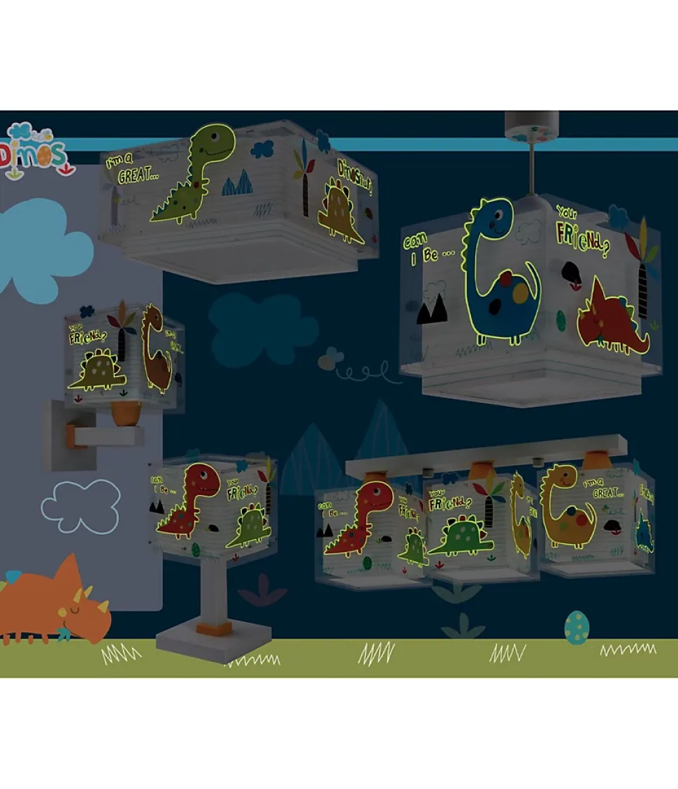 Lampe de chevet dinosaure pour enfants DinosLa lampe dinosaure pour enfant de la collection Dinos présente une composition originale de dinosaures colorés que les petits de la maison vont adorer ! Il a un double écran transparent, où les figures des dinosaures sont au premier plan, en bas de l’écran intérieur. La lampe de table avec dinosaures pour enfants Dinos est fabriquée en polypropylène transparent, un matériau qui garantit une utilisation sûre par les enfants.Lampe de chevet pour enfants avec fluorescenceLa lampe à poser Dinos a un effet de fluorescence qui surprendra les plus petits. Grâce à son utilisation, le fluor est chargé et lorsque la nuit tombe et que la lumière est éteinte, les chiffres et les lettres des dinosaures brilleront de manière fluorescente pendant quelques minutes. Cet effet est idéal pour surprendre les enfants et les accompagner pendant qu’ils s’endorment.