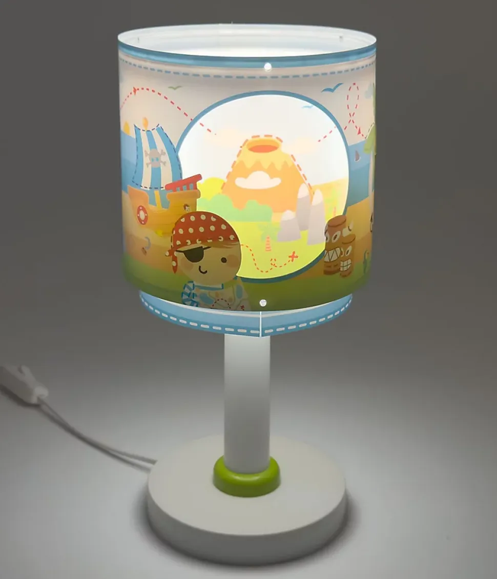 Lampe de table pour enfants Pirate Island. Île en vue ! L’aventure commence avec ce sympathique pirate en quête de trésor. Réalisé avec un double écran et avec des figures découpées pour un effet bidimensionnel.