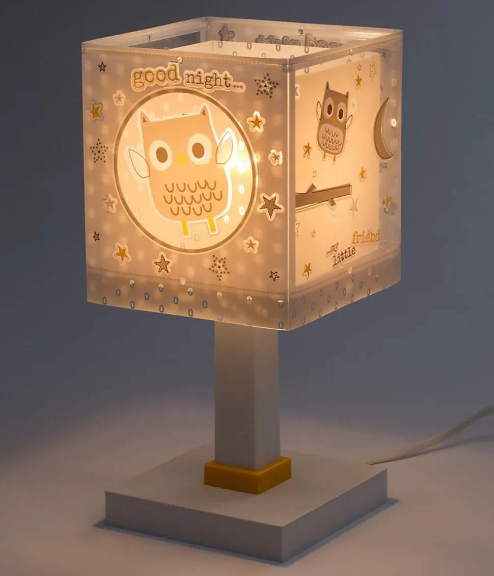 Achat lampe de chevet pour bébé Good NightLa lampe chevet pour bébé Good Night est idéale si vous souhaitez donner un air original à la table de chevet enfant. Avec un double abat-jour en polypropylène transparent et décoré d’un joli hibou et d’étoiles beiges qui brillent dans le noir, il est idéal pour éclairer en lisant, en dessinant ou dans ces moments avant d’aller dormir.Lampe de table pour enfants avec lueur fluorescenteLa lampe à poser pour enfants Good Night est fluorescente dans le noir : la nuit, dans le noir, les hiboux et les étoiles brilleront quelques minutes, pendant que les plus petits s’endorment. Combinez-le avec le reste des lampes pour enfants de la collection Good Night pour créer un ensemble unique.